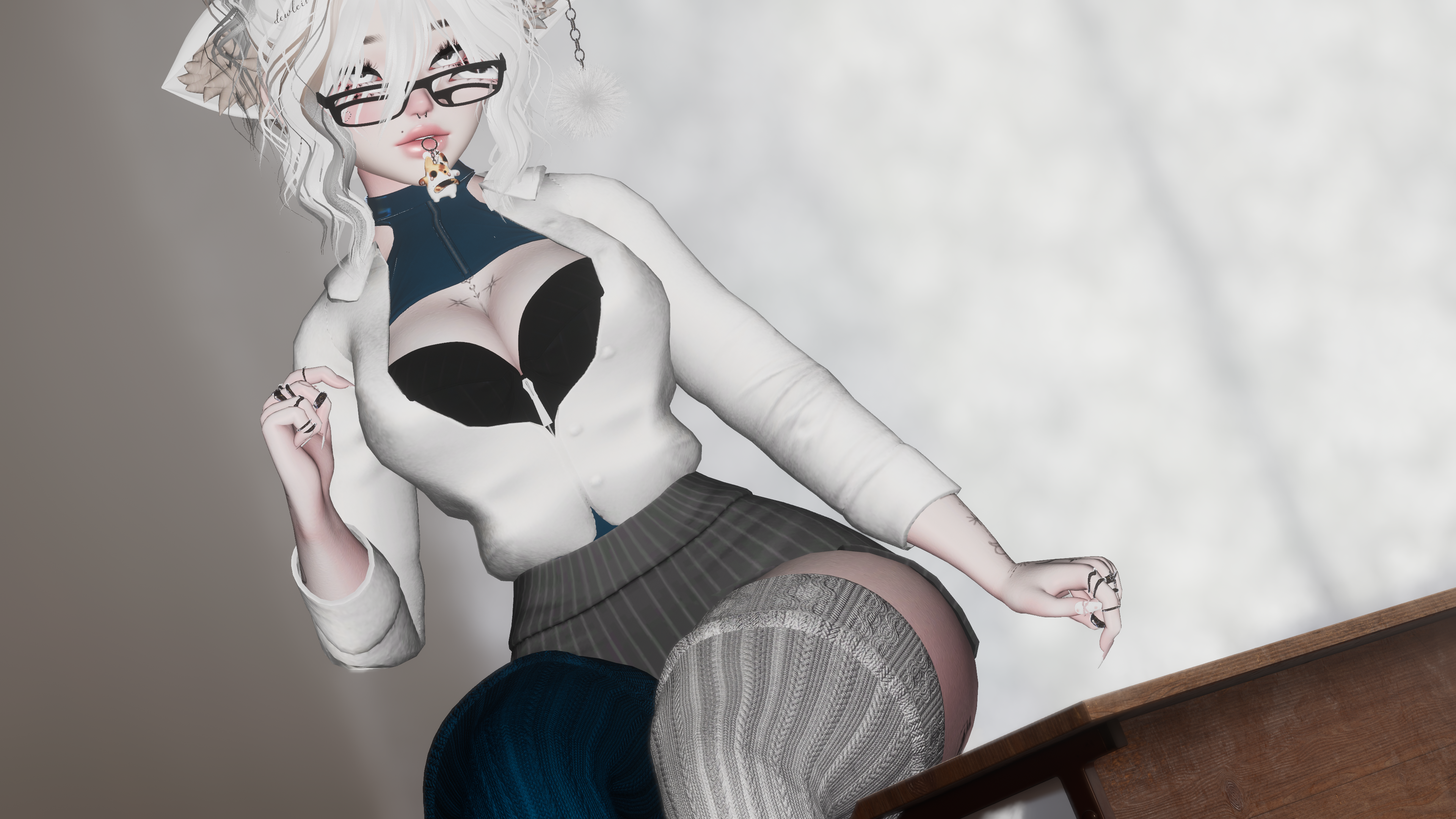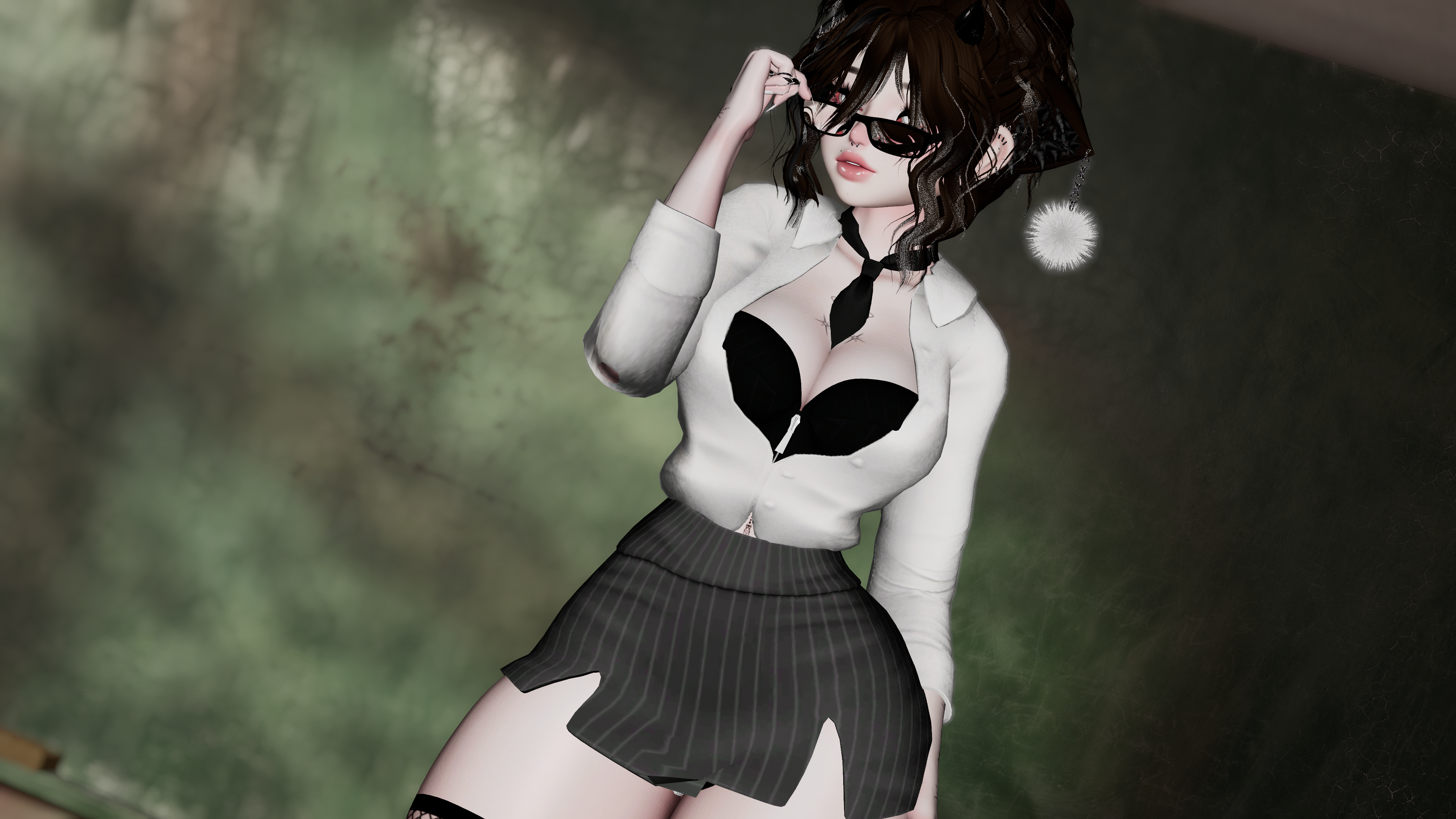 ⤷ Arm fishnets, Glasses, Jewelry, Leaf, Tie, Nails, Blazer, Blouse, Bra, Cardigan, Fishnets, Heels, Panties, Pasties, Shorts, Skirt, Slippers, Thigh highs, Top, Bangs, Base hair, Bun, Messy bun, Short hair, Fluffy ears, and Horns