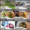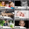 happy, sad, dirty, clean old, young, old*, new, good, bad, hot, cold, pretty, ugly, healthy, unhealthy, cheap, expensive, noisy, and quiet.