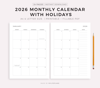 2026 Monthly Calendar with Holidays on 2 Pages, Printable & Fillable, A4/Letter Size