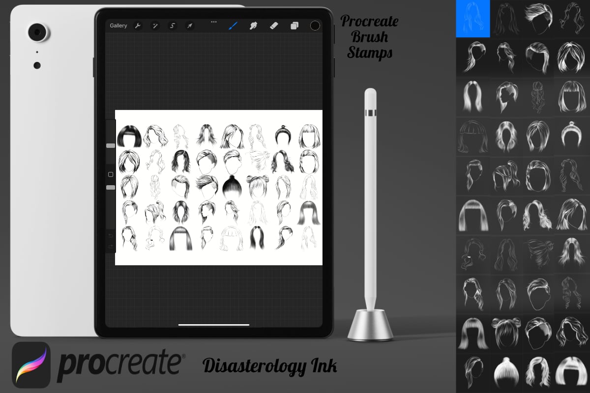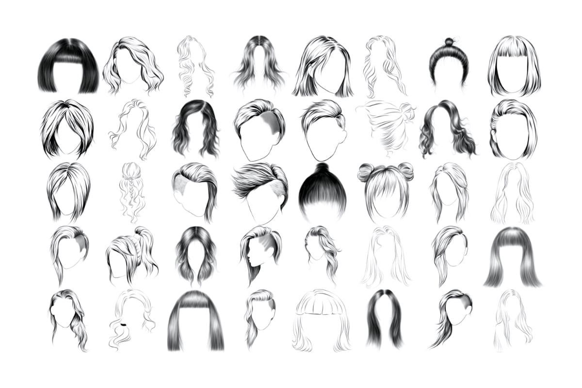 Womens Hair Fashion Set 1 Procreate Brush Stamps, 40 Hair Stamps