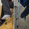 Arriving at the hospital with a taxi he crutches to the entrance and through the corridors to the waiting room. Sitting there you can see his right foot in detail and the sock he wears over his toes and foot. At one point he rearranges his sock where you can see a part of the cast splint as well. He is a really good crutcher by the way.