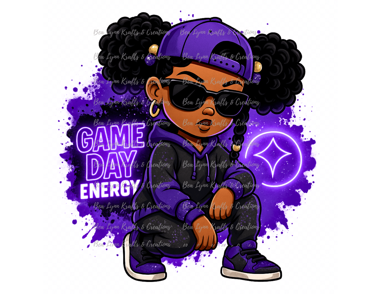 Unleash unstoppable fan attitude with this electrifying “Game Day Energy” transparent PNG featuring a fierce cartoon girl decked out in purple and black! With a backwards cap, oversized shades, gold hoops, glittery sneakers, and a confident squat pose, she brings unmatched swag to every design. Surrounded by neon-inspired splashes and game-ready vibes, this image is perfect for creators who want to serve up hype, heart, and high fashion.