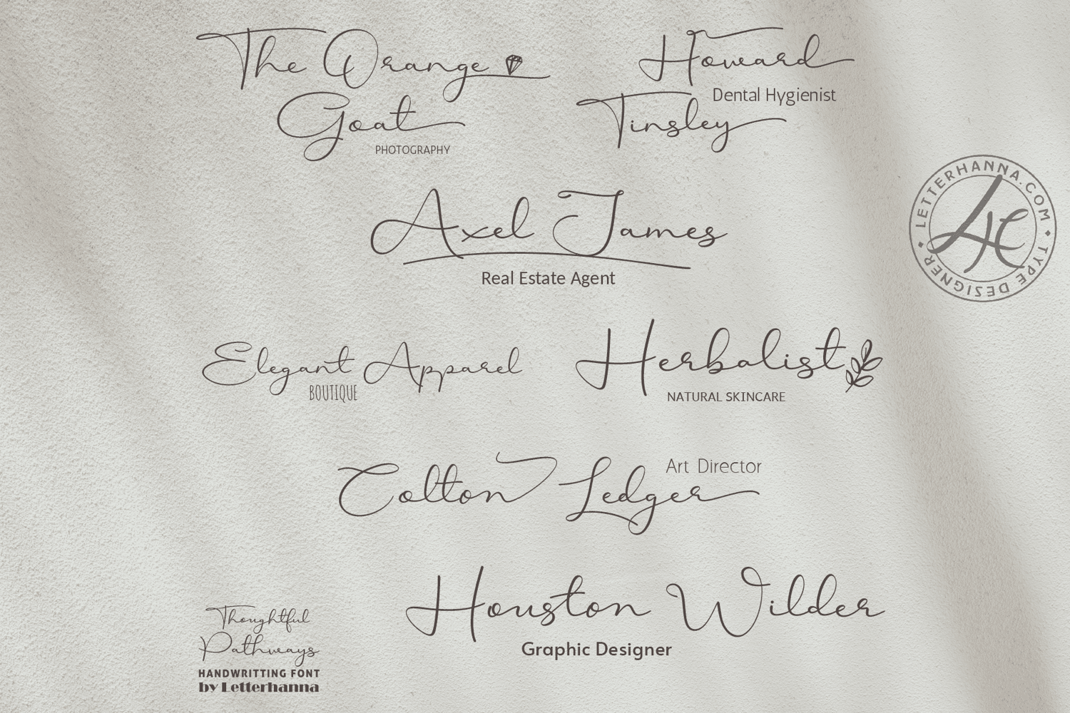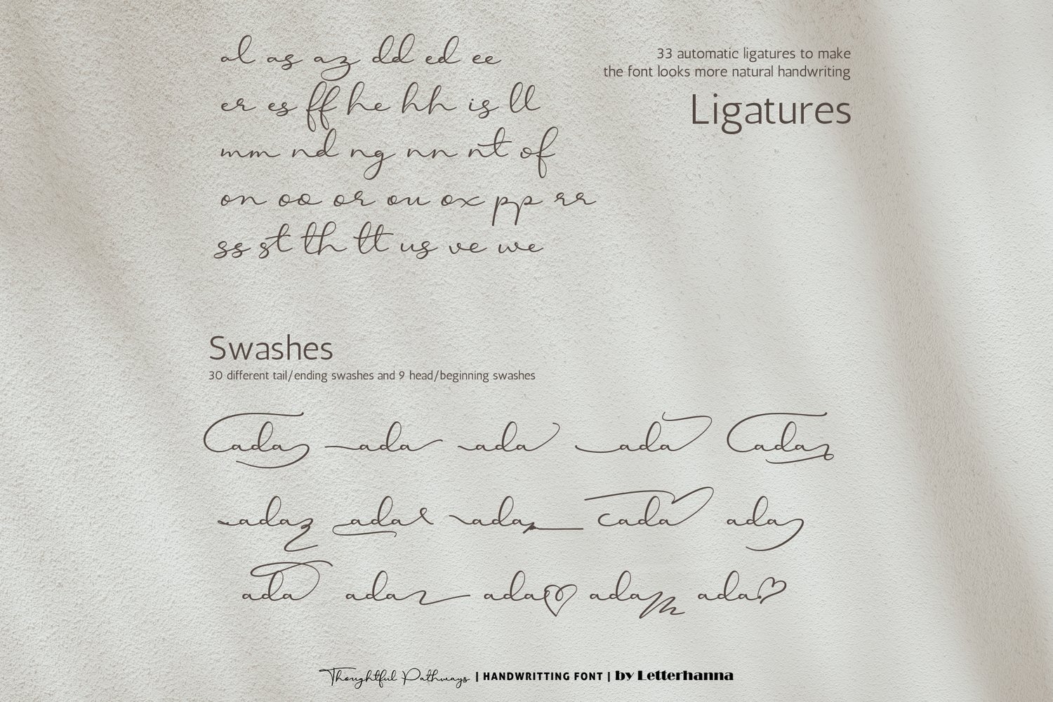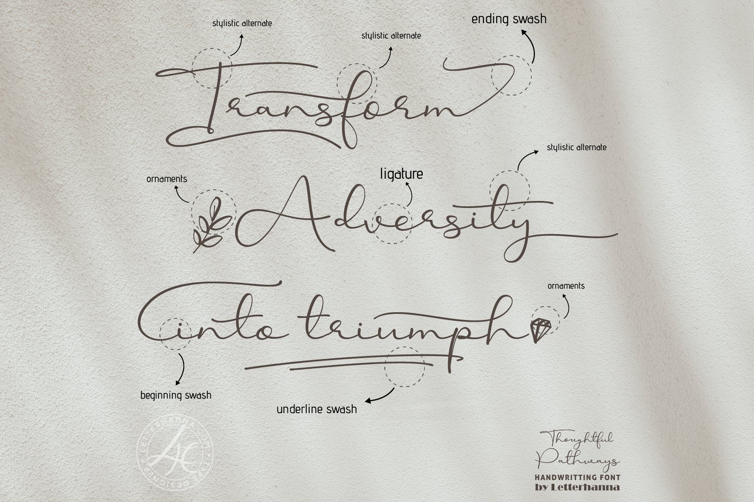 Thoughtful Pathways Font was created to look as close to a natural handwritten script as possible by including over 33 natural-looking opentype ligatures, Uppercase and lowercase Stylistic Alternate, a lot of head/beginning swashes and tail/ending swashes. There are also 30 underline swashes included and lot more ornaments, arrow, scribbles, etc.