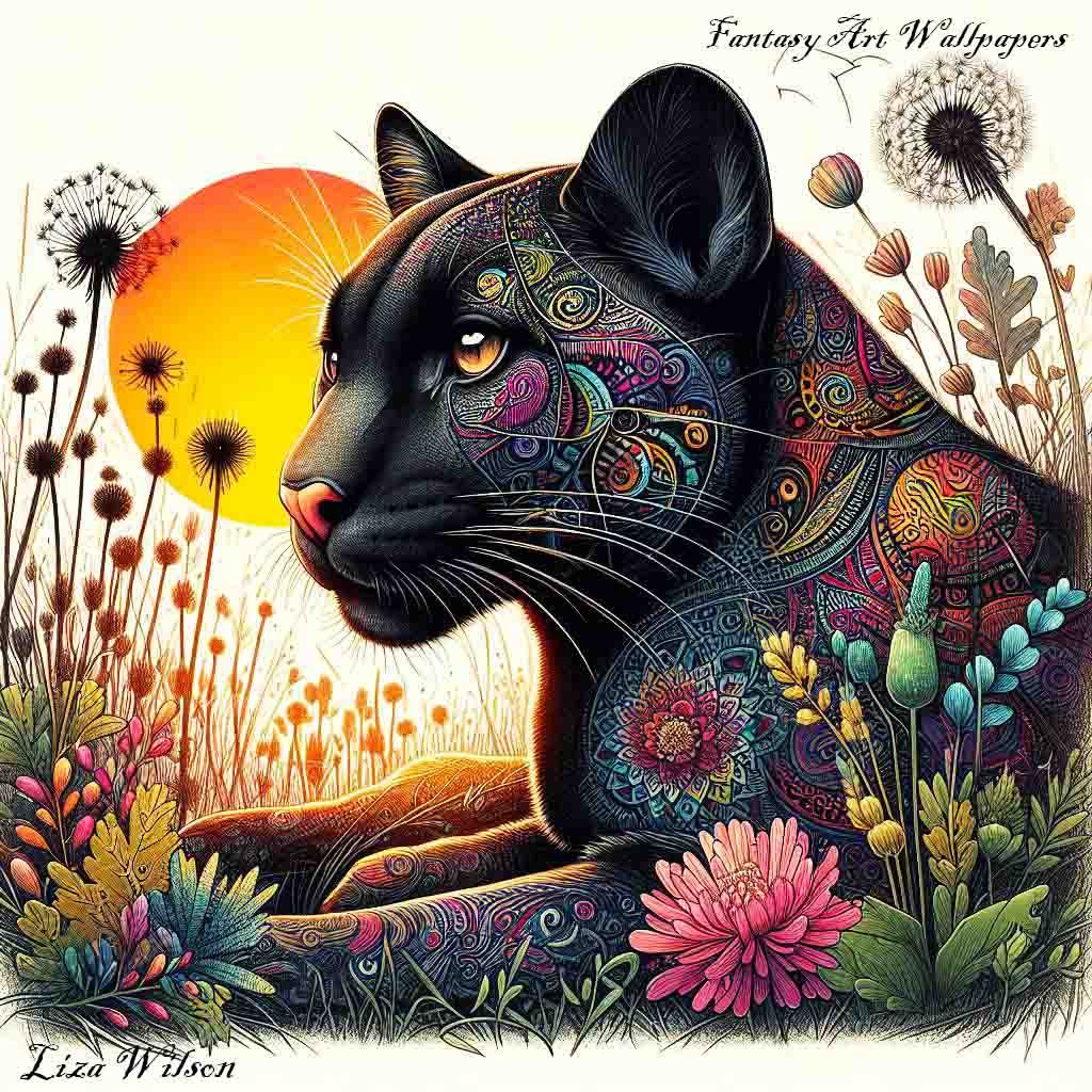 Patterned black Puma under a low setting sun. There are colourful flowers & grasses.