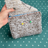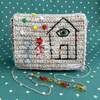 A crochet purse with a zipper + top flap closure, pleated side panels, and detachable strap. This design is a subtle fade of white and beige, with a needlefelted and beaded design of a surreal children's drawing on the front flap, beads spelling "you're safe here" on the front face, and an interior pocket with a heart.