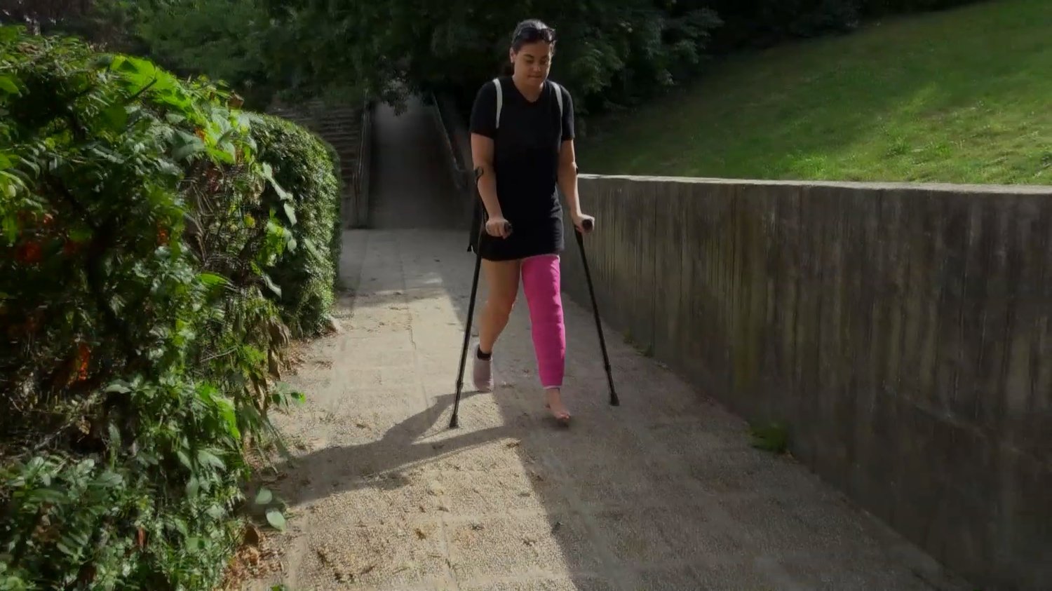Poor Timmi hurt her left knee a couple of weeks ago after her accident with the bike, she went biking while listening to music and another bike came out of nowhere. Now Timmi is casted in a pink cylinder cast which means that she can still move her ankle and use her foot as long as it doesn’t hurt too much. Timmi crutches while holding her injured leg straight out until she comes across some stairs that she had to go up through, she stop for a minute to figure out how to do that because she can’t lift her casted leg high enough for the steps. After she figured it out Timmi slowly crutches up very carefully, she puts her foot down every now and then because she can’t hold it up all the way. It hurts too much and she isn’t strong enough. Timmi moans out in pain as she makes it to the last step. As Timmi crutches we can clearly see her casted leg in a very good view the entire time, finally Timmi decided to take a rest and crutches up to a big stone.