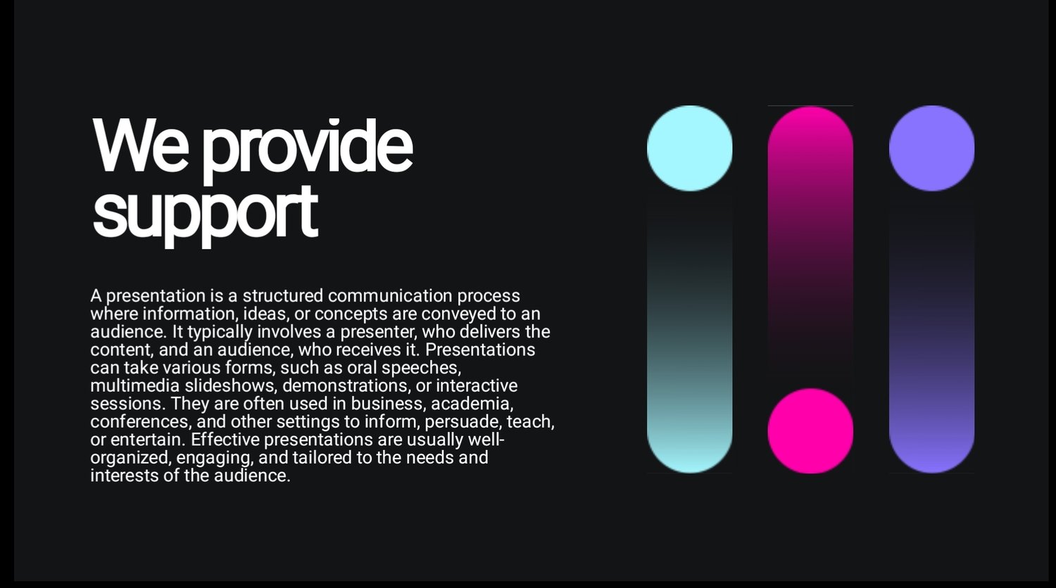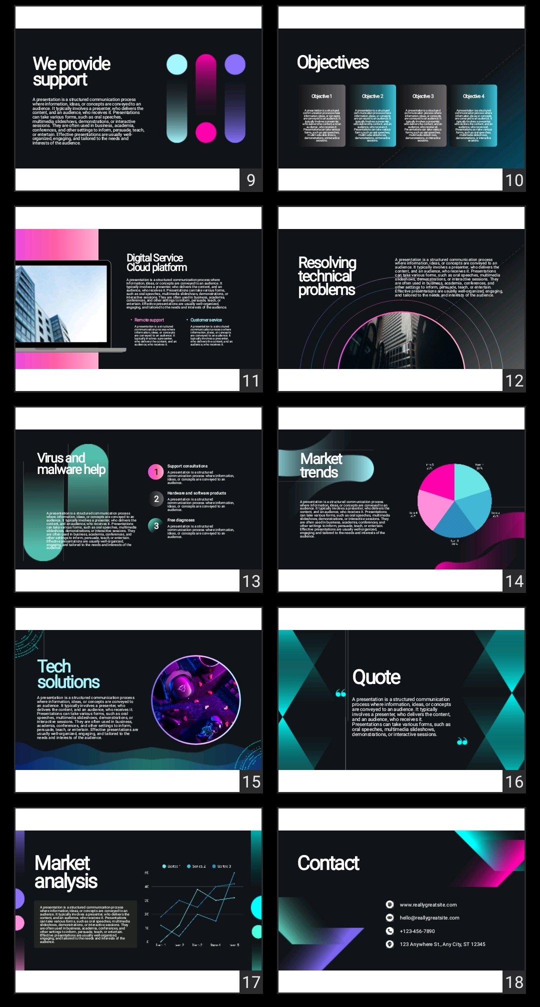 The design features a dark, futuristic style with colorful gradients, charts, icons, and clean layouts that help you communicate your ideas clearly and professionally.