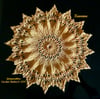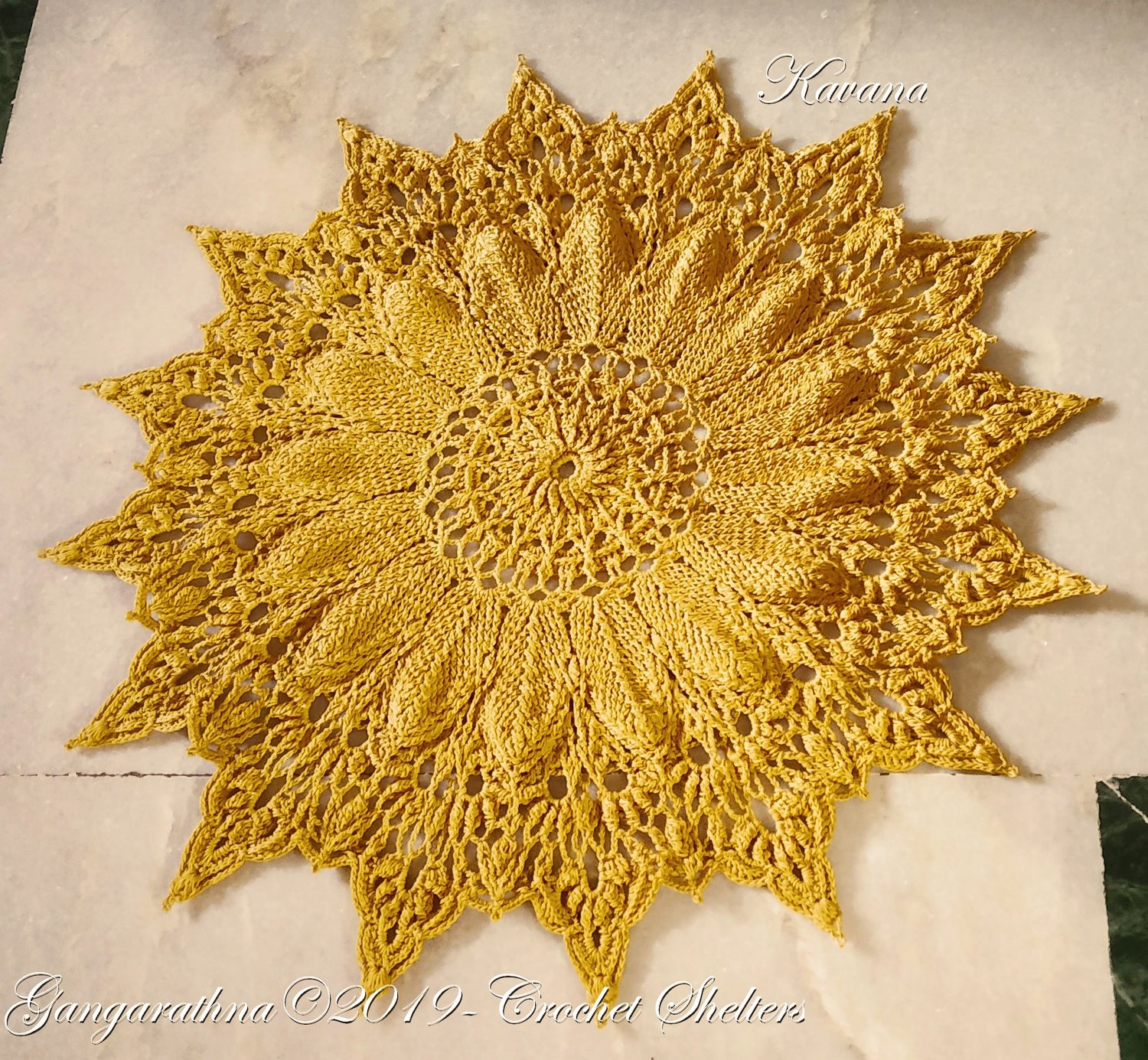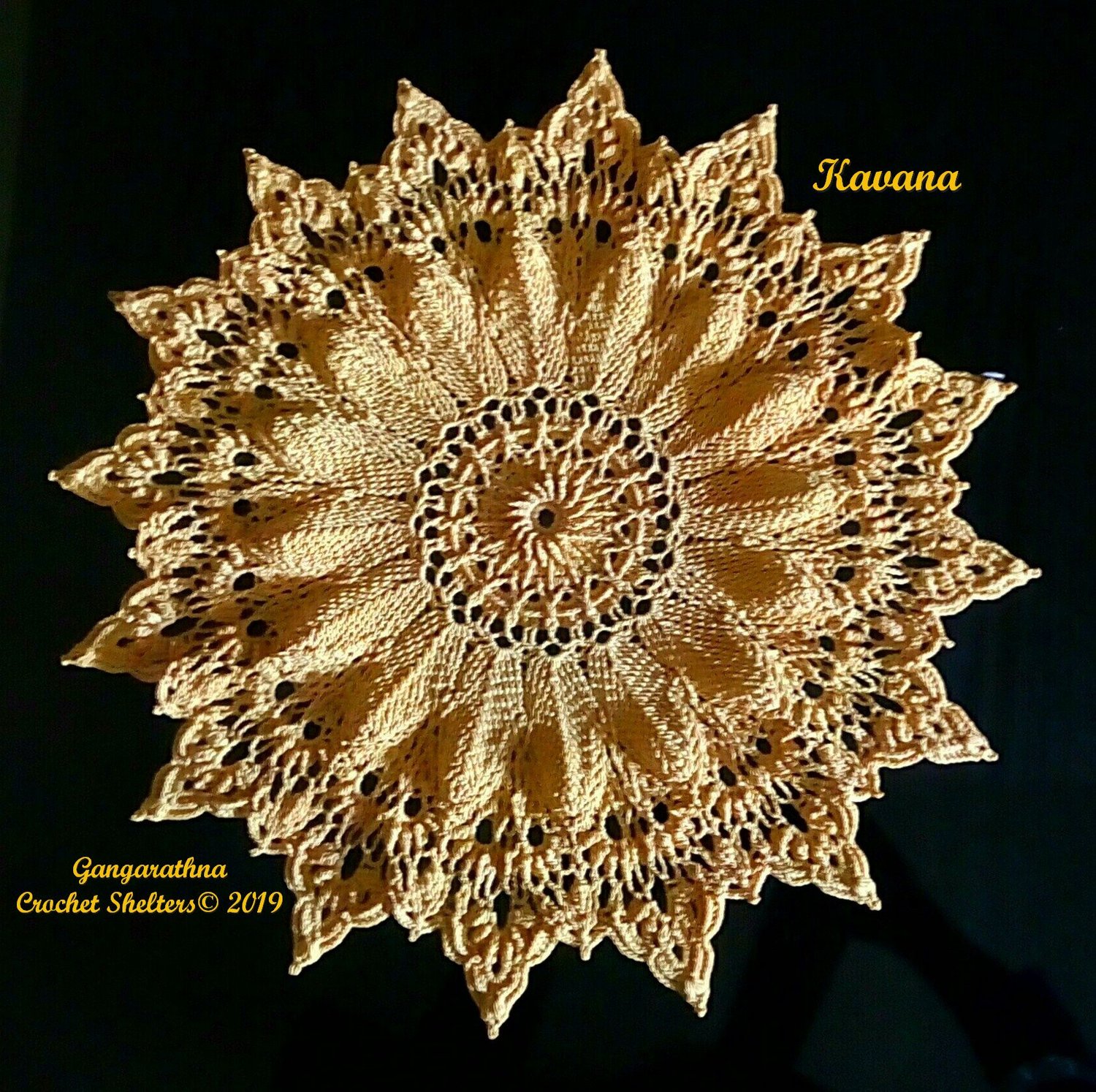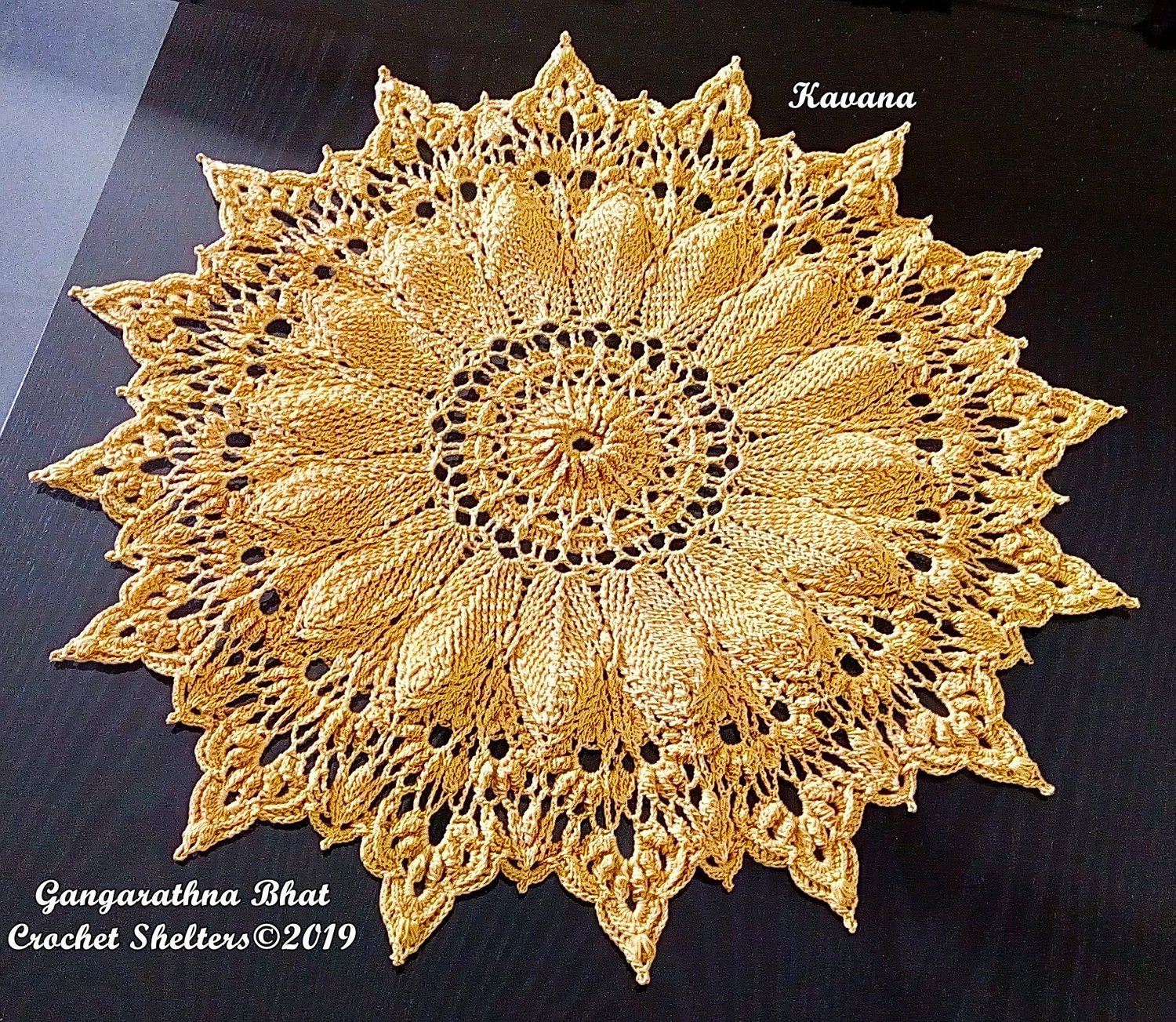 Pattern consists of 30 rounds and measures 16 inches, used around 450 yards of size 20 mercerised cotton thread with 1.75 mm steel hook.