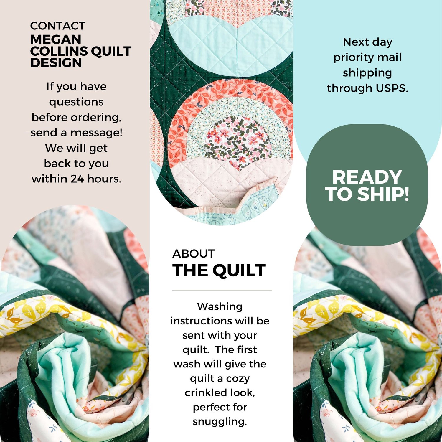 Bring warmth, love, and gentle color to your child’s space with this handmade floral rainbow baby quilt, ready to ship and made to be cherished. Sewn with care in soothing shades of greens, pinks, and aqua, this quilt is both beautiful and meaningful — a keepsake designed to last through childhood and beyond.