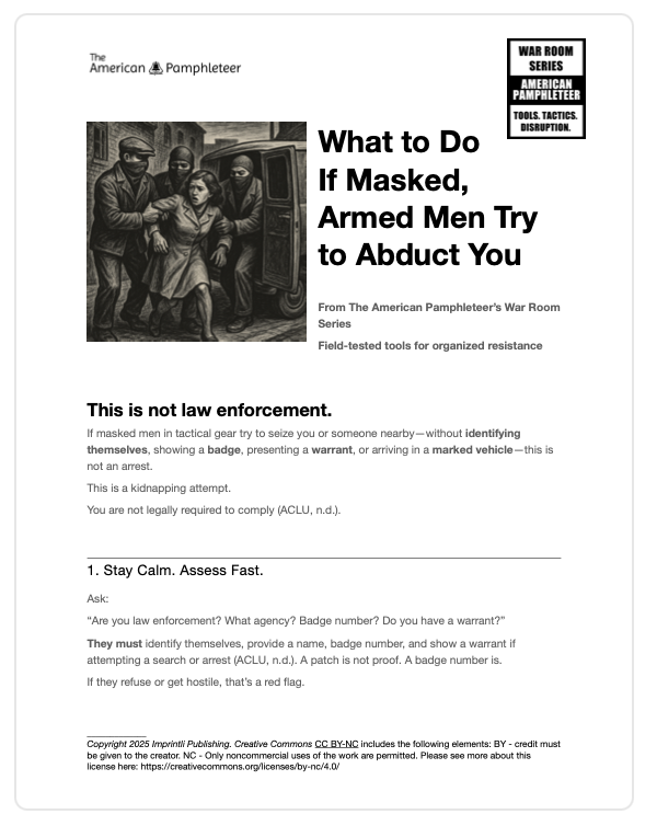 If masked men in tactical gear try to seize you or someone nearby—without identifying themselves, showing a badge, presenting a warrant, or arriving in a marked vehicle—this is not an arrest.