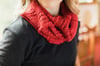 This cowl is knit in the round, and features narrow reverse stockinette stitch borders. The pattern is now re-written for worsted and bulky weight yarns.
