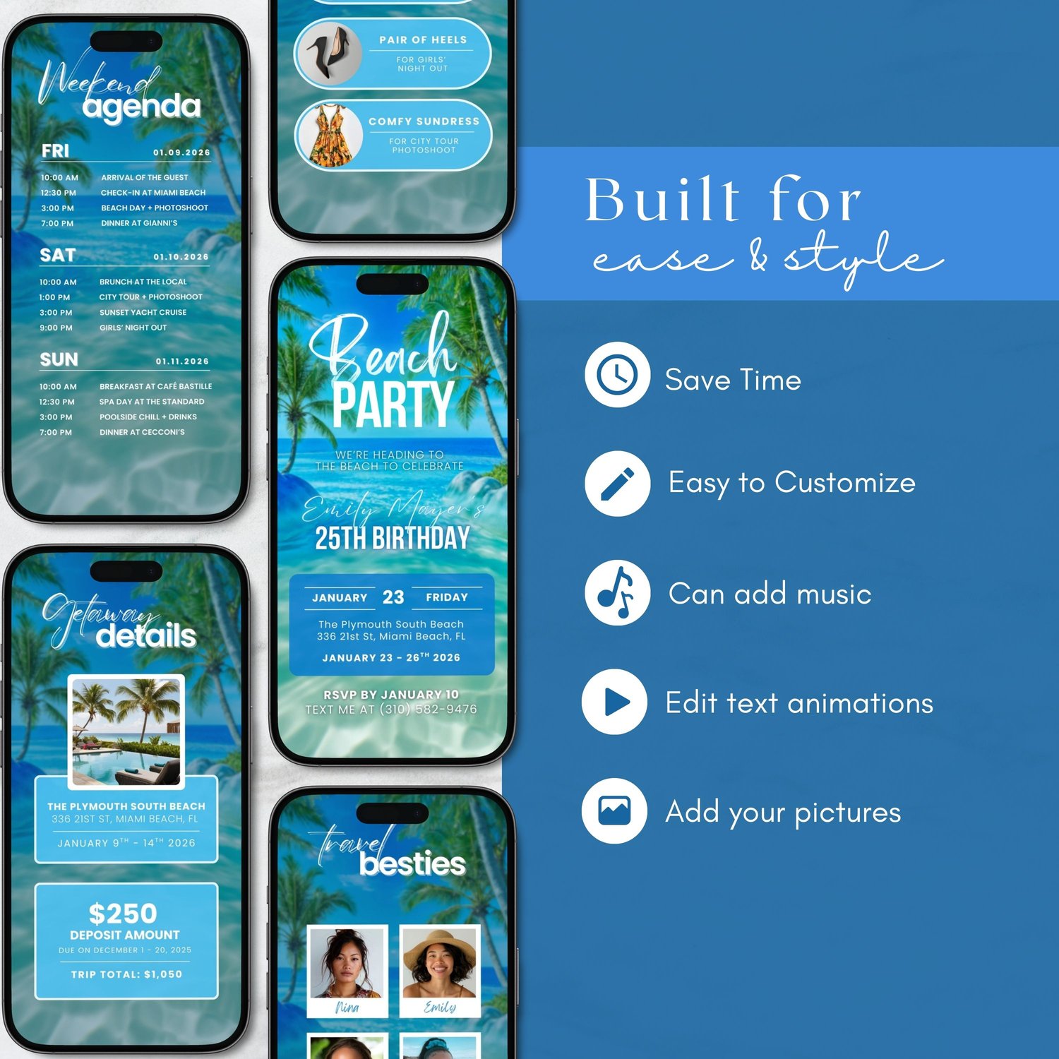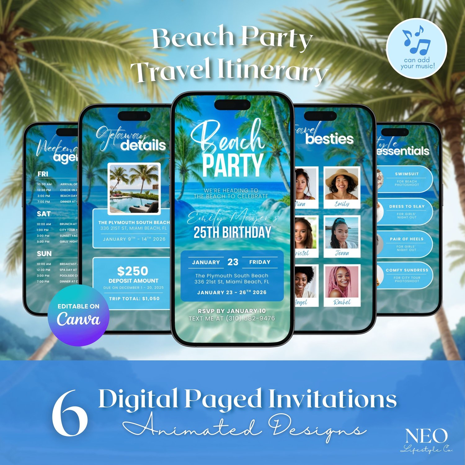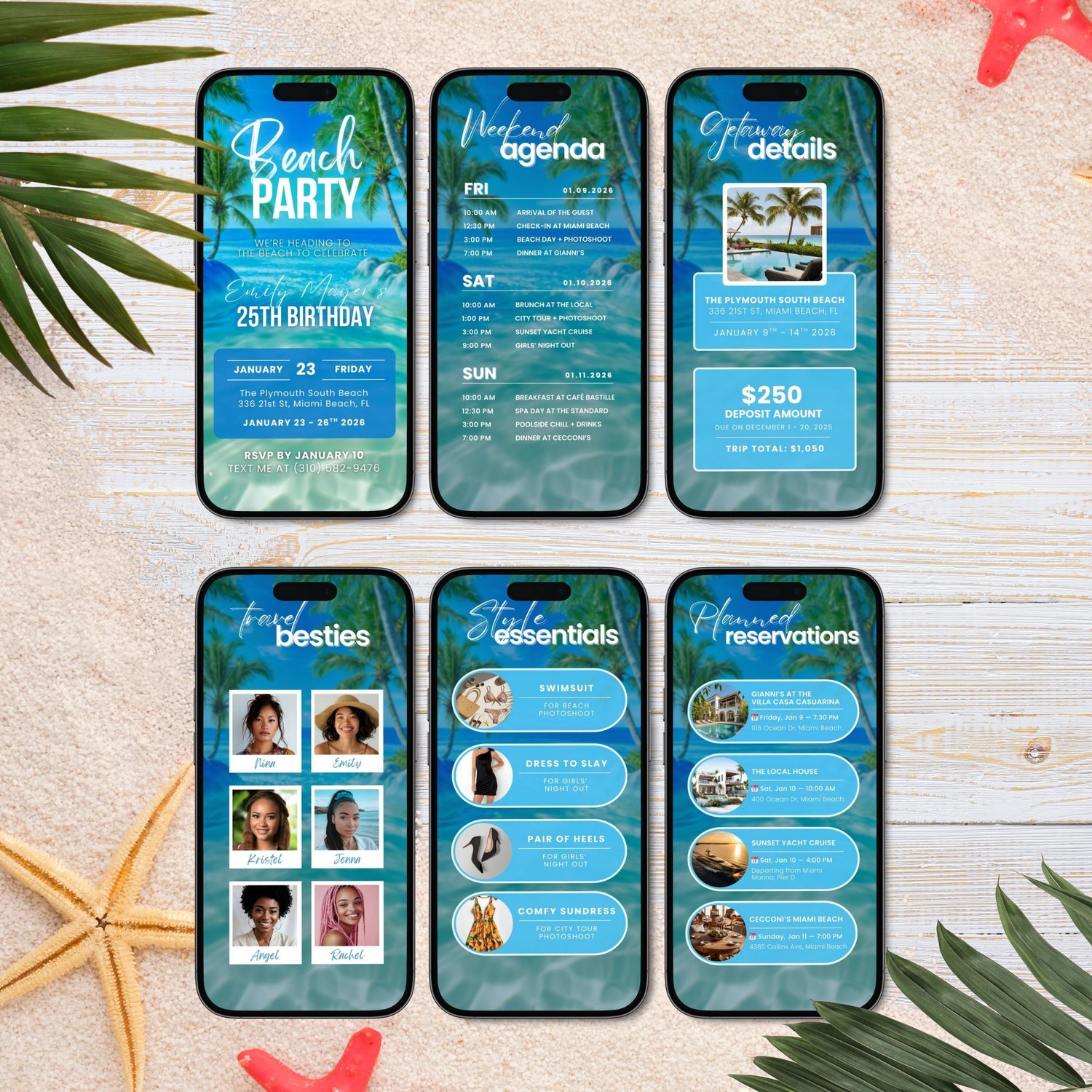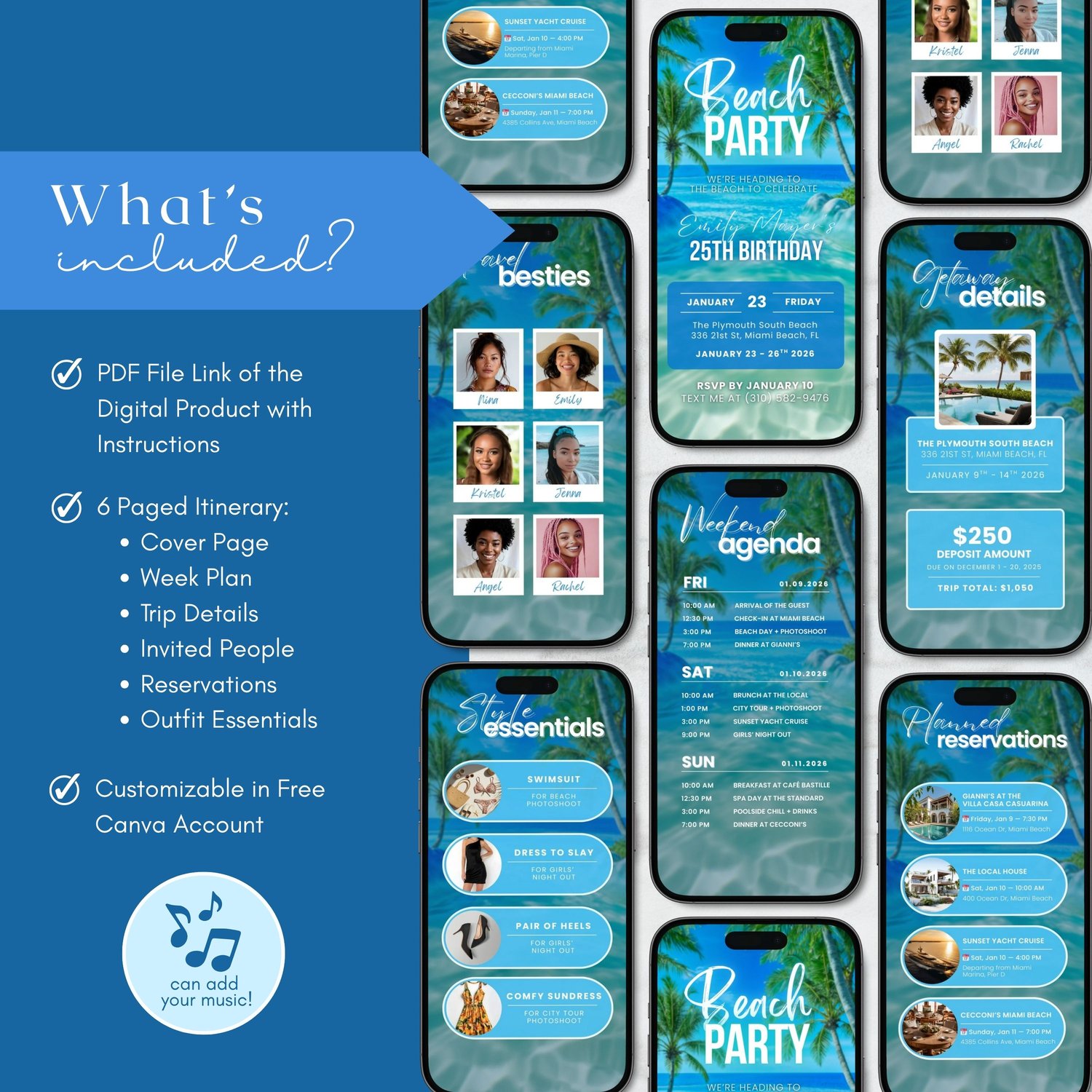 Digital Travel Itinerary, Birthday Weekend Invitation, Blue Beach Party Invite For Girls Trip, Bachelorette Trip (Animated Canva Template)