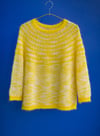 Este jersey está tejido desde arriba hacia abajo, en circular y sin costuras. Empezamos tejiendo el cuello y todo el canesú con aumentos y franjas en el punto de margaritas. En las sisas, los puntos de las mangas se dejan en espera mientras se teje el cuerpo en circular. Al final, volvemos a los puntos de las mangas y tejemos en circular hasta el puño.