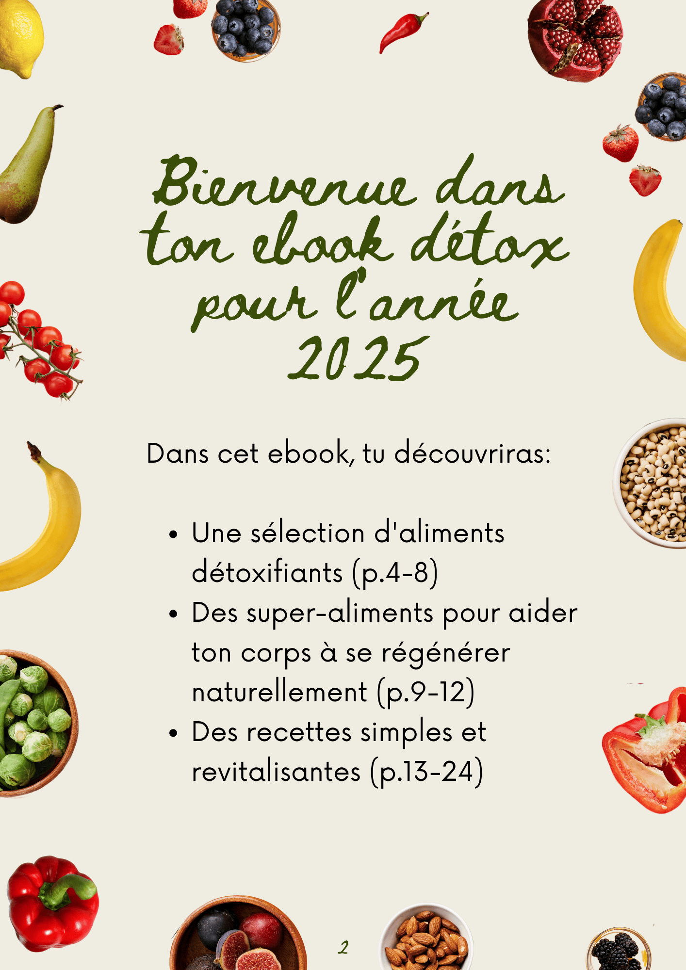 - Une Sélection d'Aliments Détoxifiants (p.4-8) : Apprends à intégrer des aliments naturels qui aident ton corps à éliminer les toxines et à retrouver son équilibre.