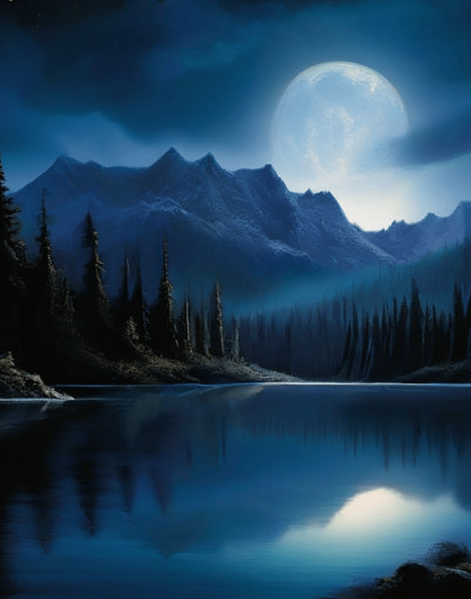 Serene Lake Moonlight, Full Moon, Twilight, Mountain Landscape, Forest Painting, Moonlight nocturnal Beauty, Vintage Nightlife Nature, Natural Wall Art, Vintage Landscape, Nostalgic Nature, Cool Nature, Rustic natural Landscape, Painting.