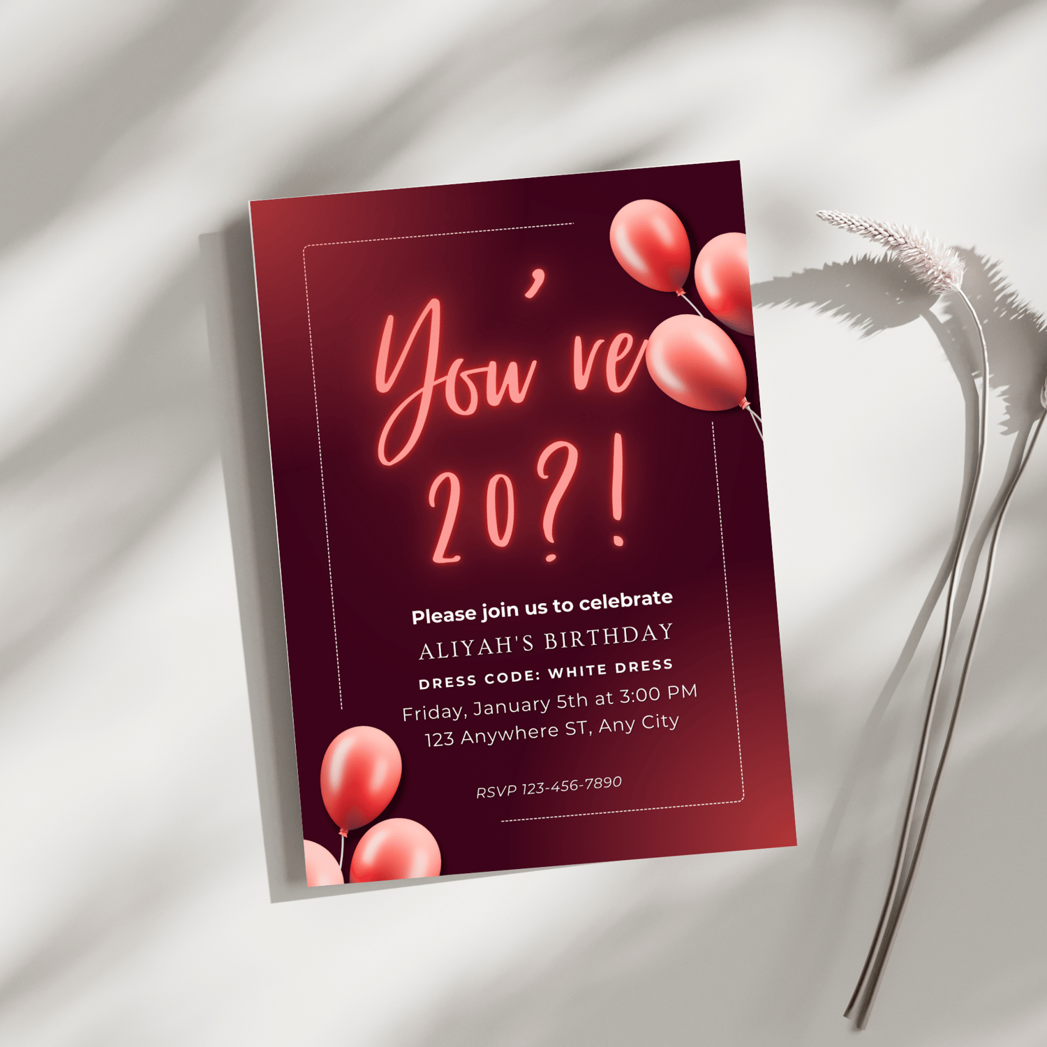 Customizable You're 20?! birthday invitation ideal for your upcoming celebration. You can alter this red invitation yourself with Canva. Should you decide to print it yourself, cardstock invitation paper can be used to create a 5x7 print. You can also have the finished file printed by taking it to a print shop. Additionally, it can be saved as an image and used as an email or text invitation. The text is all modifiable.