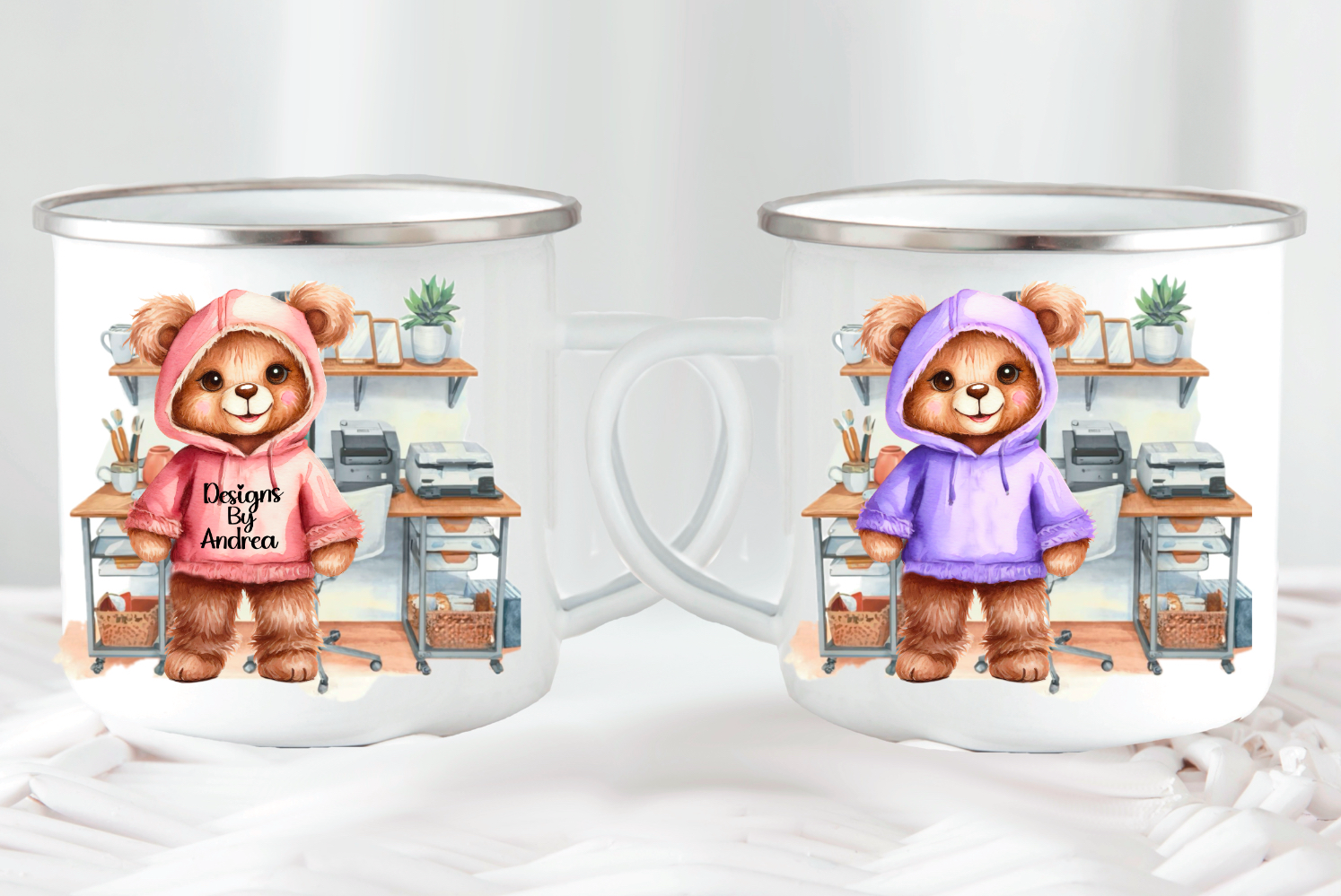 1 main graphic file with teddy bear in a pale pink hoodie, with background including desk, printer, heat press etc, 12 additional hoodies as shown to mix and match. 13 PNGs.