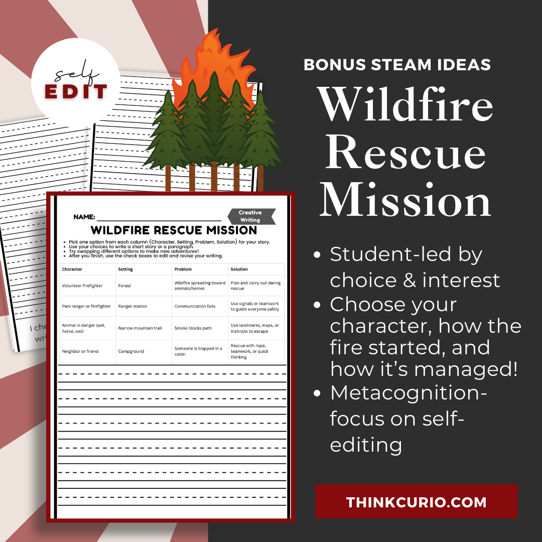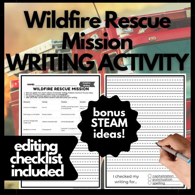 Inspire bravery and quick thinking in your students with Wildfire Rescue Mission, a creative writing activity for 2nd–5th graders. Students mix and match characters, settings, problems, and solutions to write exciting rescue stories that build narrative skills, problem-solving abilities, and descriptive writing.
