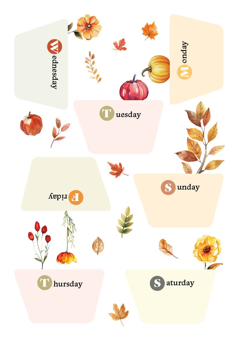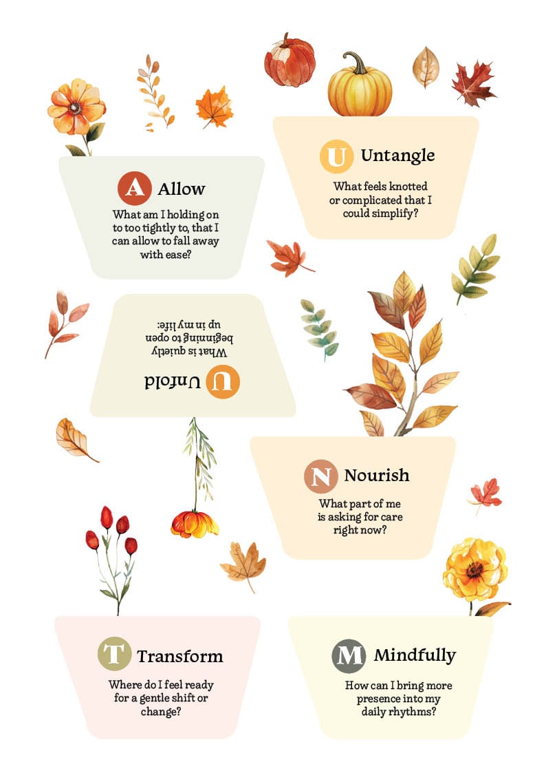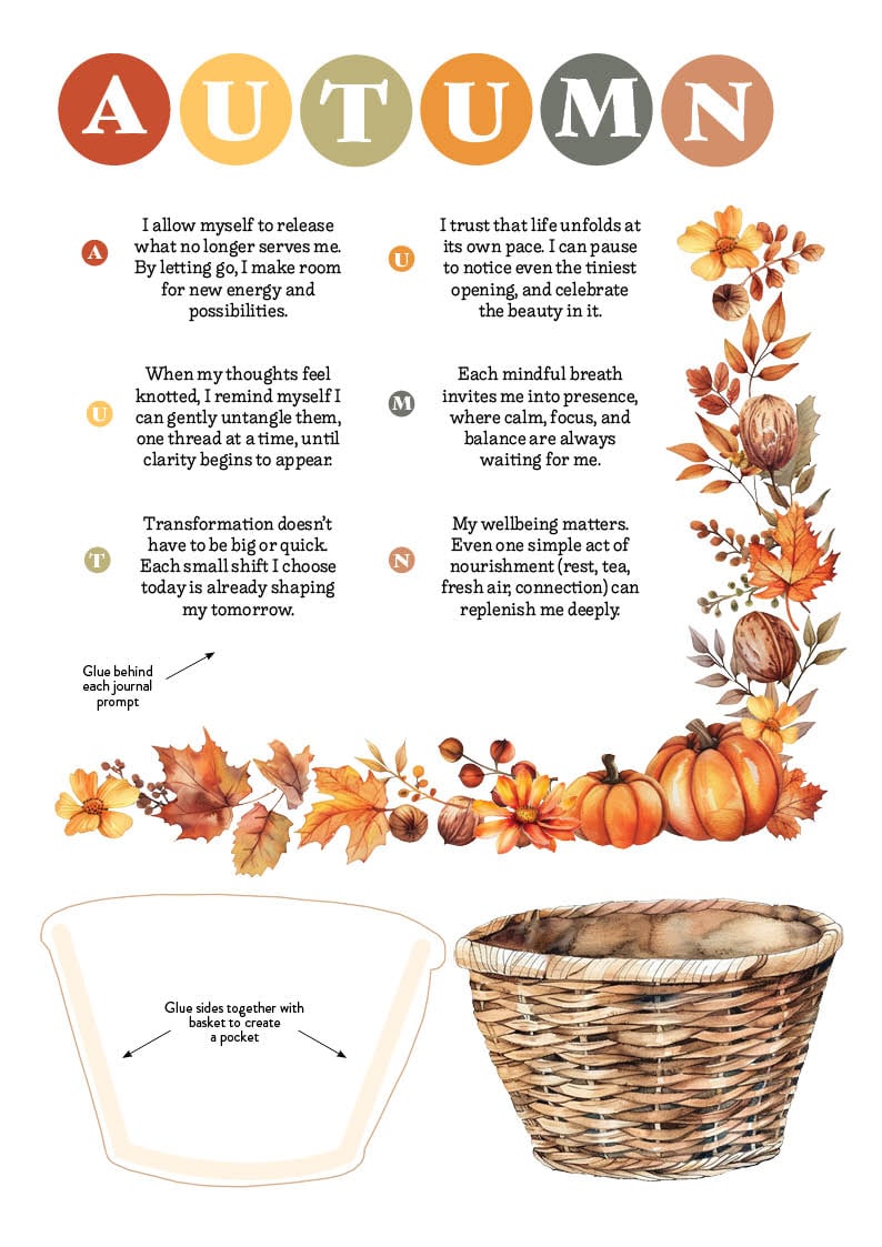 Alongside beautiful autumn decors, you’ll find in this little kit, 6 journal prompts, each designed to help you: