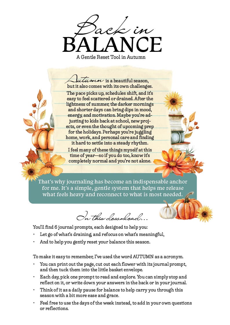 Autumn brings beauty and change—but also busy days, shifting rhythms, and dips in energy. If you’re feeling scattered or stretched thin, you’re not alone. Back in Balance offers gentle tools and guided journal prompts to help you slow down, reflect, and realign with what truly matters. Through simple questions and mindful moments, you’ll find your way back to calm, steadiness, and a softer rhythm that suits the season.