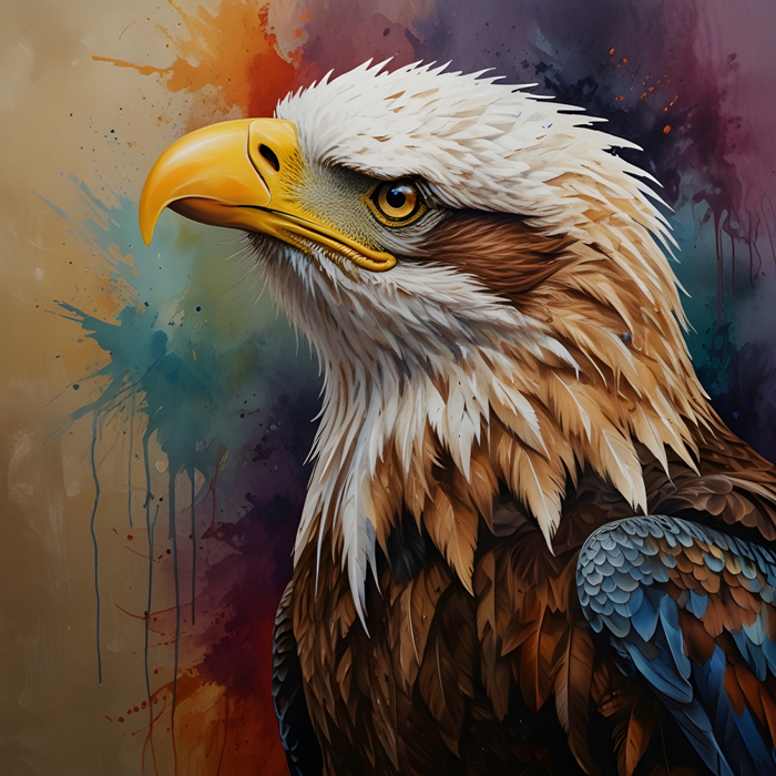 The image is a close-up of an eagle, showcasing its striking beak and feathers. The majestic bird of prey belongs to the Accipitridae family and is possibly a bald eagle or golden eagle. This detailed painting captures the beauty and fierceness of this magnificent creature in wildlife art.