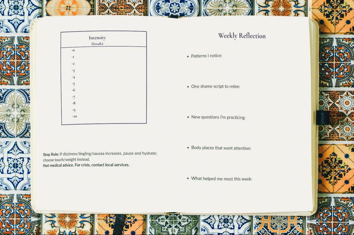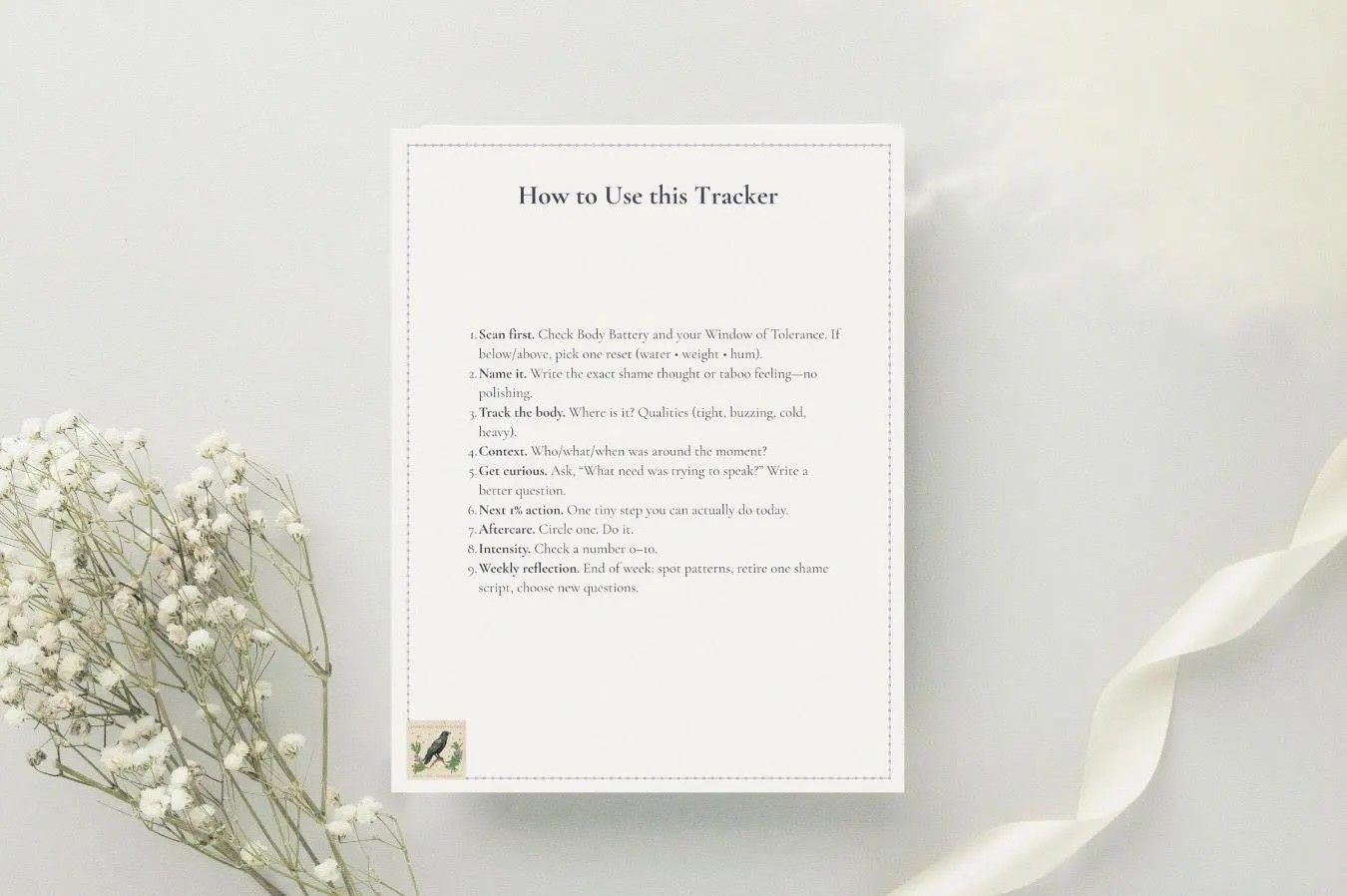 This printable worksheet guides you to move from “freeze & shame” into gentle curiosity and choice. Begin with a quick Body Battery scan and your Window of Tolerance, then track the exact thought/feeling, body sensations, context, a better question, your next 1% action, aftercare, and intensity (0–10). A weekly reflection page helps you spot patterns and retire old shame scripts.