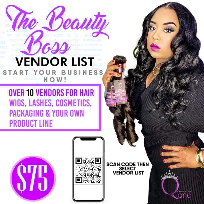Start your very own BEAUTY BUSINESS TODAY! This list has not only has over 10 amazing quality virgin hair, wig, lash and cosmetic vendors, but also packaging and branding vendors. 3 new bonus vendors just added. Also comes wit a private facebook group to further help you with your business. After you purchase vendor list request THE BEAUTY BOSS GROUP via facebook for additional tips and business info. With this vendor list you can launch your beauty business with the proper BANG for a BIG BEAUTY BO$$.