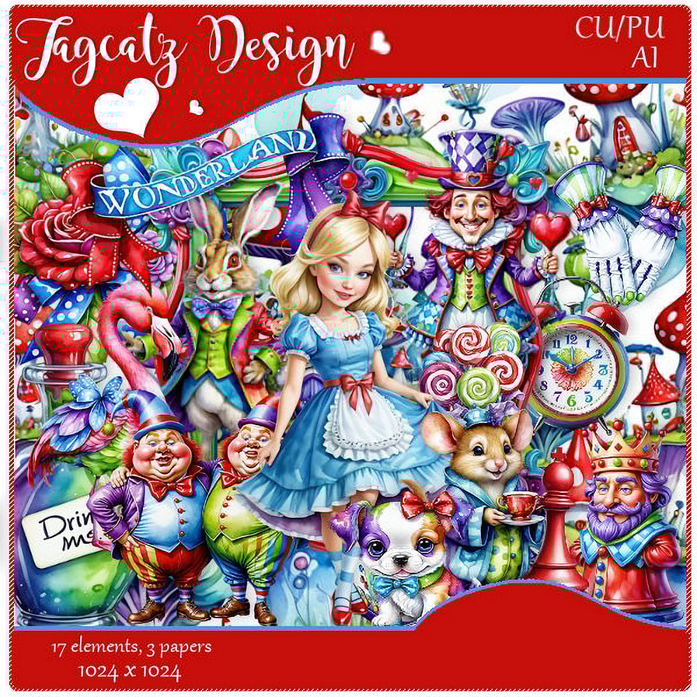 17 elements and 3 papers all with an Alice in Wonderland theme. CU/PU. 1024 x 1024 saved at 300dpi. AI product.
