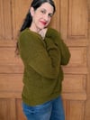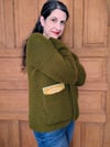 The Kitchen Table Cardigan is worked seamlessly from the bottom up. After the split for the arms the back and fronts are worked separately and the live stitches are seamed together at the top shoulder. The sleeves are worked from the shoulder to the cuffs, and finally the button band is worked as an applied edging, knitted directly on to the body of the sweater. The pockets are inset and have a fun contrast color lining.