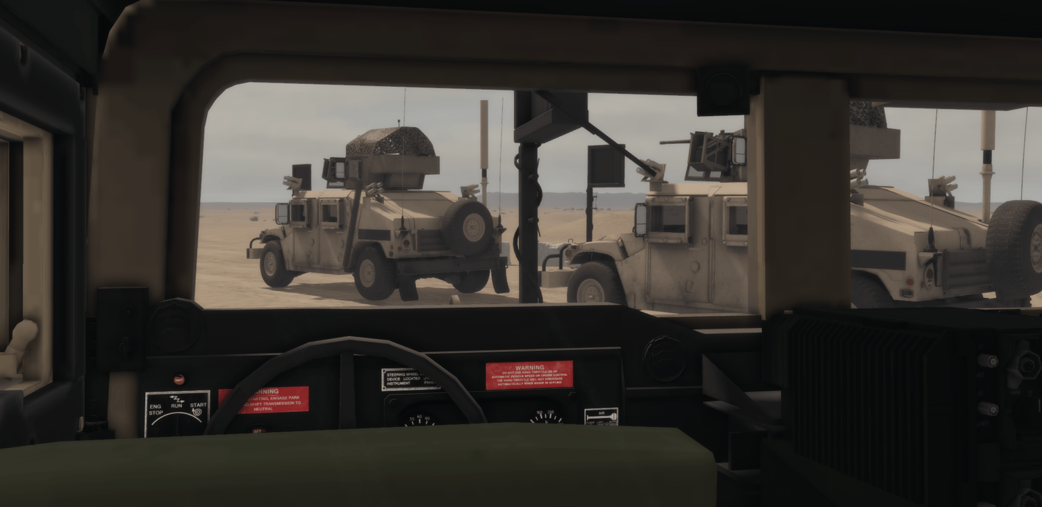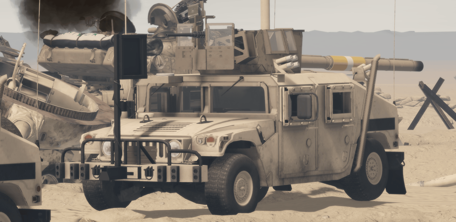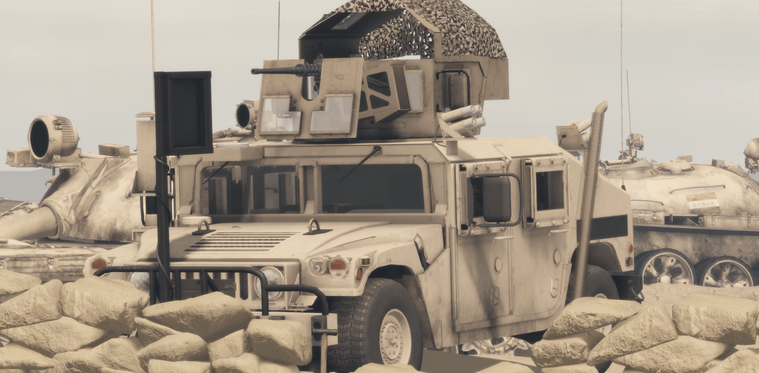 The M1151 HMMWV in a “Desert” configuration is tailored for operations in arid and open environments. It features the same up-armored protection against small arms and explosives, but with desert camouflage, enhanced cooling systems, and dust-resistant filters to handle extreme heat and sand. Typically armed with a roof-mounted machine gun or grenade launcher, it is used for patrol, convoy escort, and rapid-response missions where mobility, reliability, and visibility over long distances are essential.