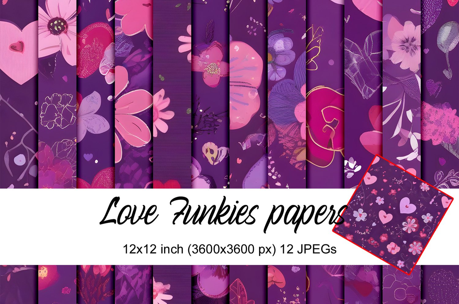 Keywords: Love Funkies Digital Paper, Funky Heart Patterns, Weird Flower Scrapbook Paper, Abstract Floral Textures, Indie Art Journaling, Unconventional Valentine Paper, Colorful Weird Art, Funky Hearts, Weird Flowers, Abstract Patterns, Junk Journaling, Scrapbook Supply, Commercial Use, AI Art, Bold Colors, Unique Textures, Indie Style, Papercrafting, Valentine Ephemera.