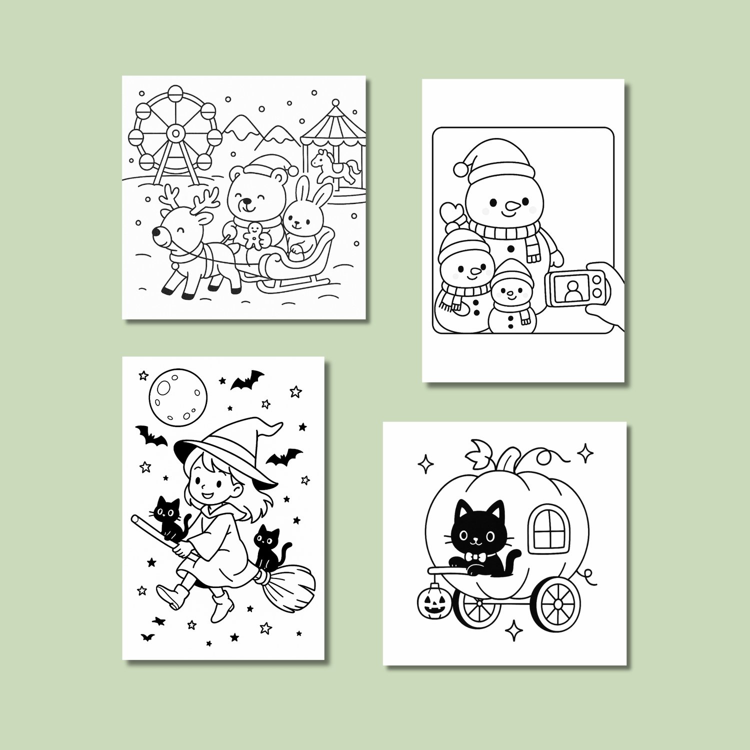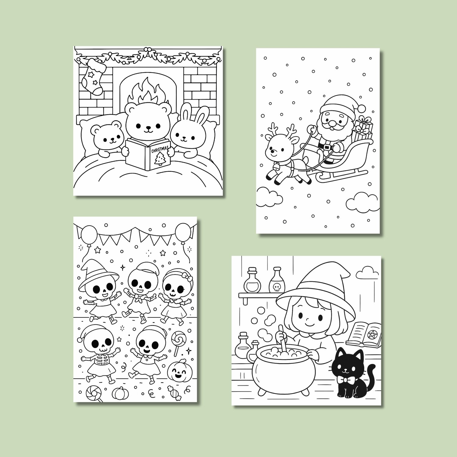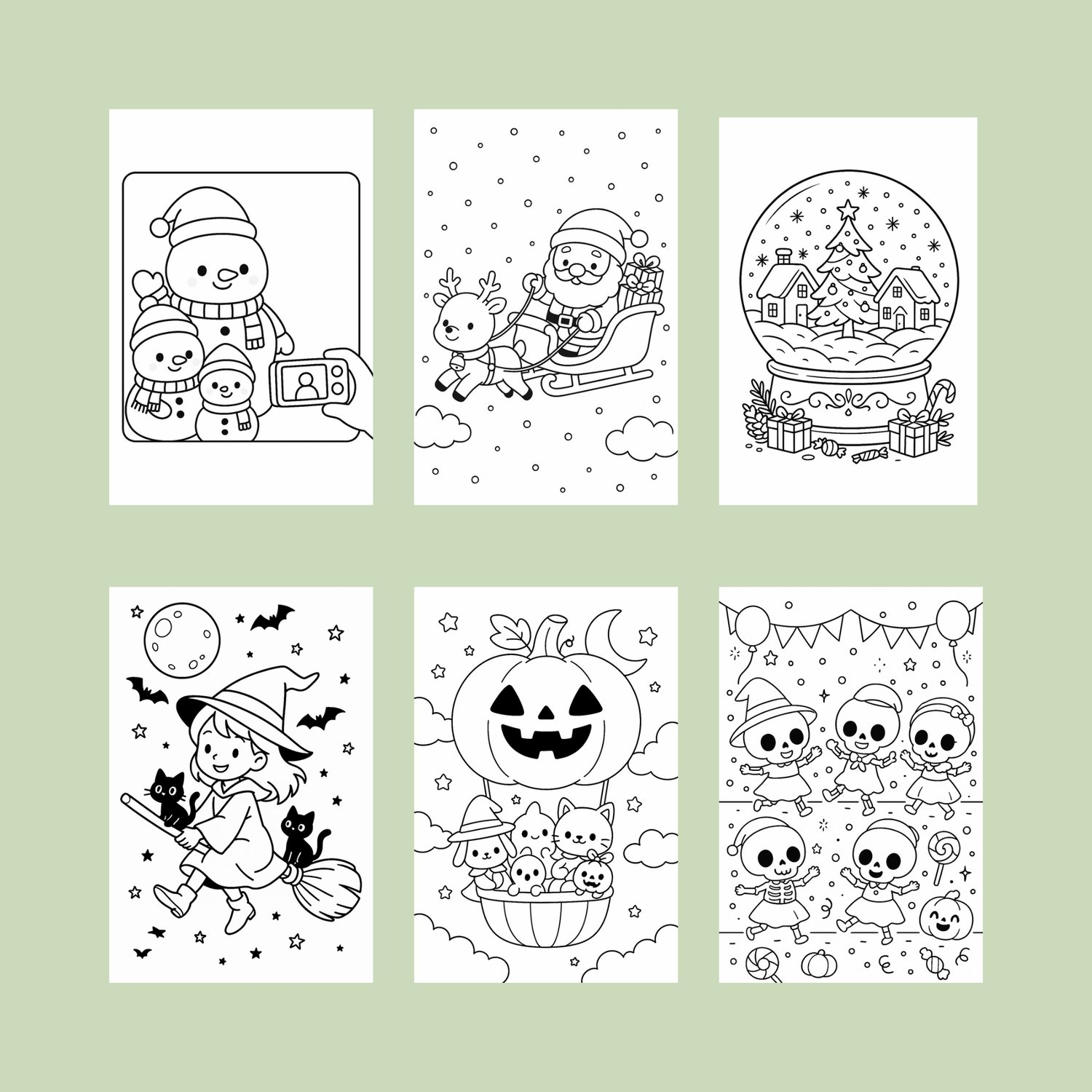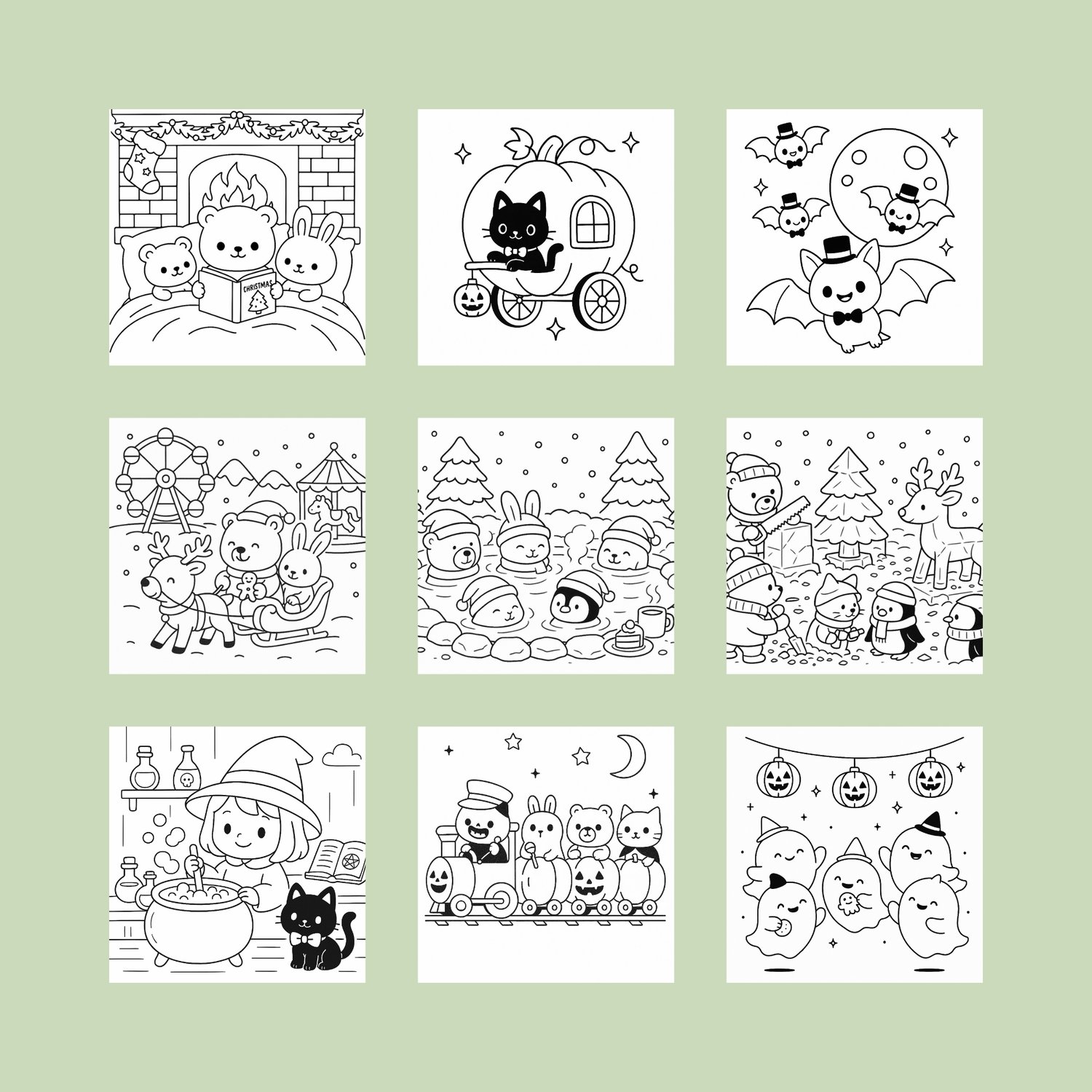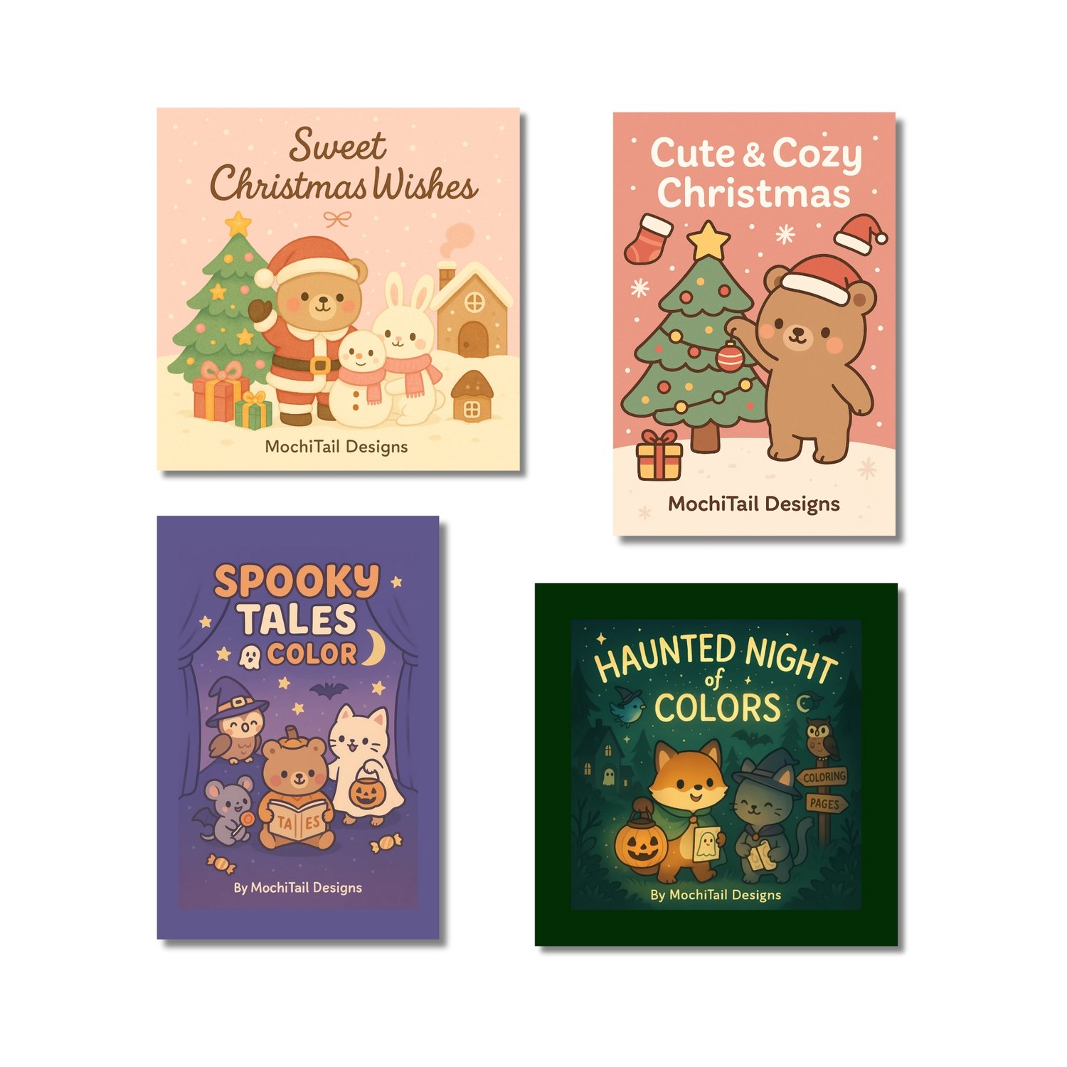 Celebrate the magic of the holidays with this Holiday Mega Coloring Book Bundle, featuring 4 adorable kawaii-style coloring books — 2 Halloween and 2 Christmas editions!