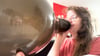 Isla blowing a nice black balloon to the maximum until it goes BANG
