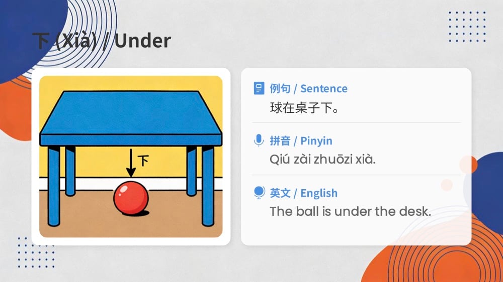 - Learn 8 Essential Words: Master the core directional terms: 上 (shàng/on), 下 (xià/under), 左 (zuǒ/left), 右 (yòu/right), 前 (qián/in front of), 后 (hòu/behind), 里 (lǐ/inside), and 外 (wài/outside).