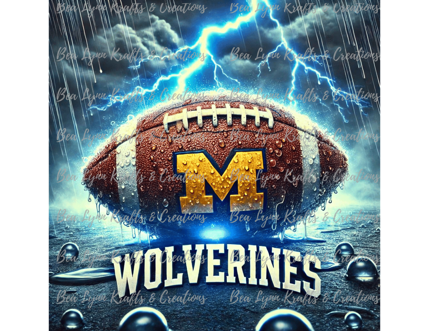 Ready to bring the storm? This Michigan Wolverines Football PNG is packed with electric energy, stormy vibes, and Wolverine pride! Featuring a bold maize "M" on a rain-soaked football, set against a lightning-split sky, this high-resolution transparent PNG captures the heart-pounding thrill of Big House Saturdays and championship dreams. Perfect for true fans who bleed blue and gold—this design turns every product into a declaration of dominance!