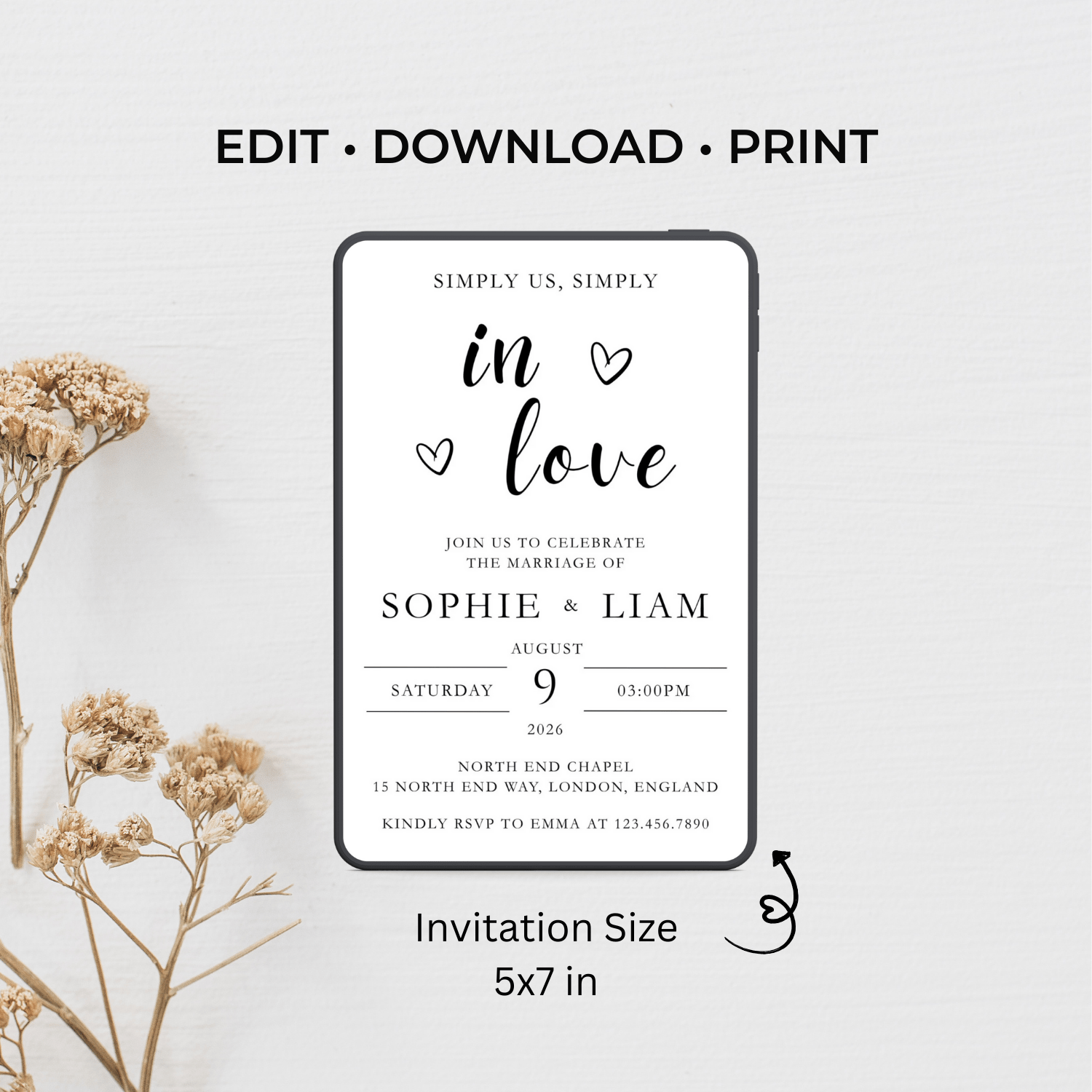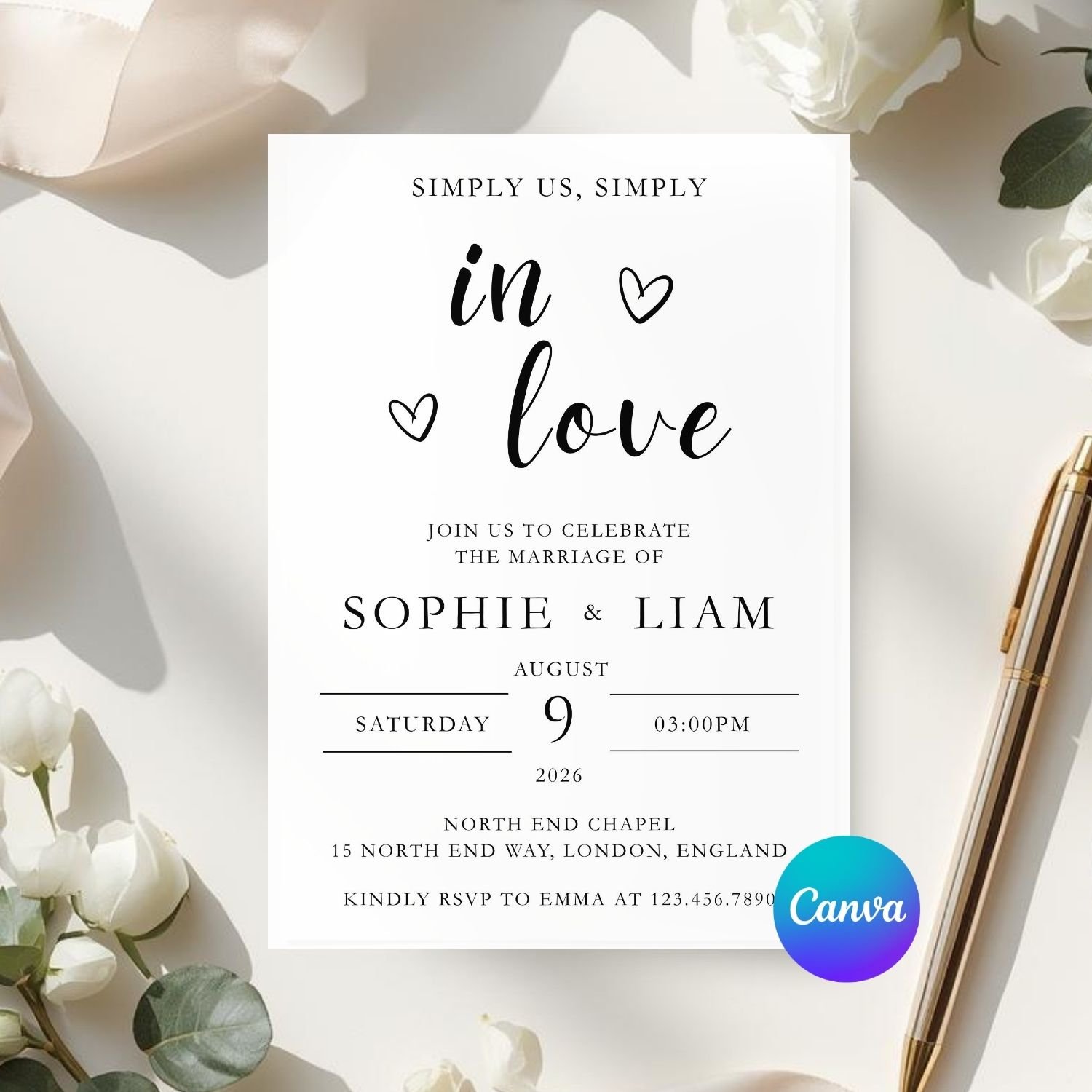 W001 Editable Minimalist Heart Wedding Invitation Template | Canva Wedding Invite | Instant Download