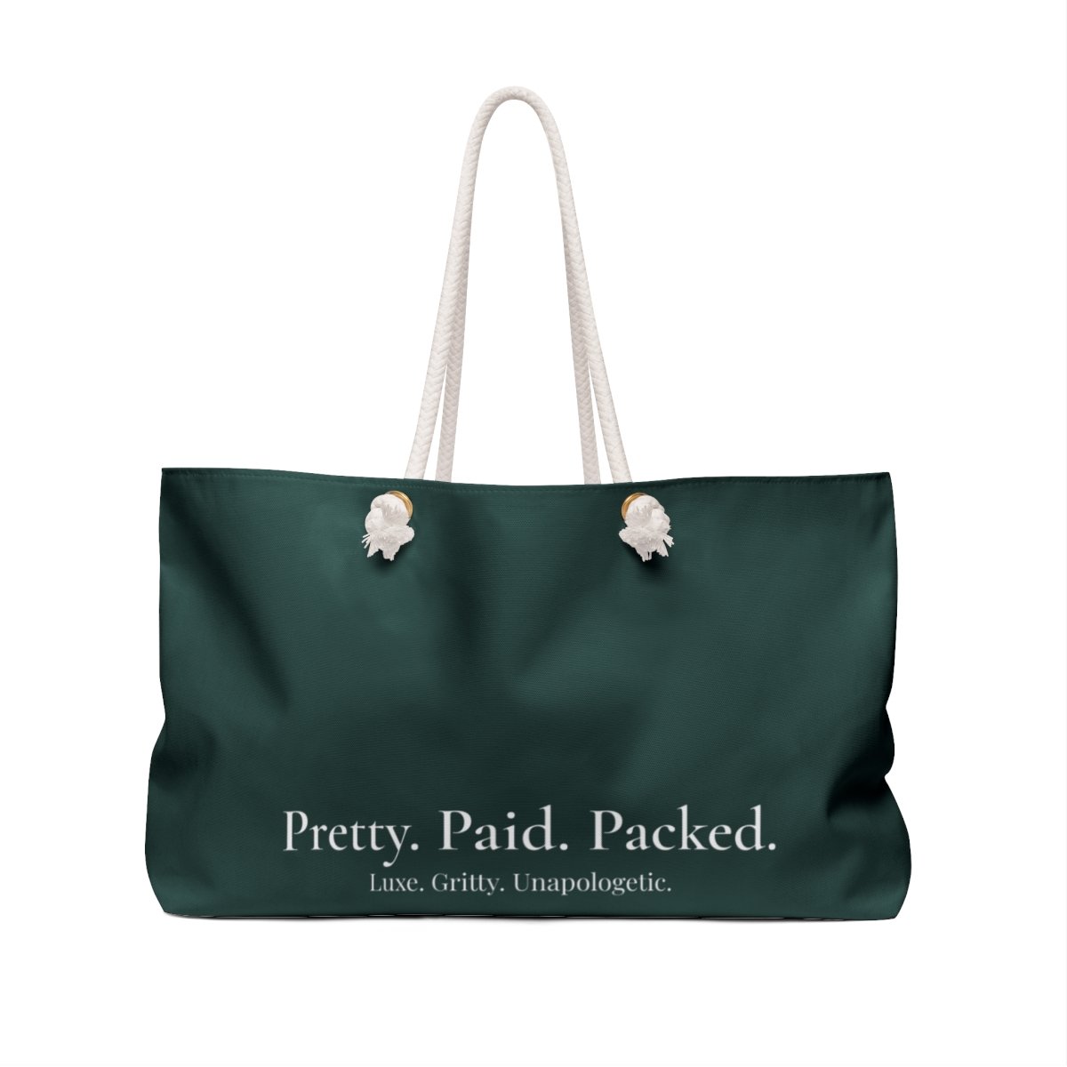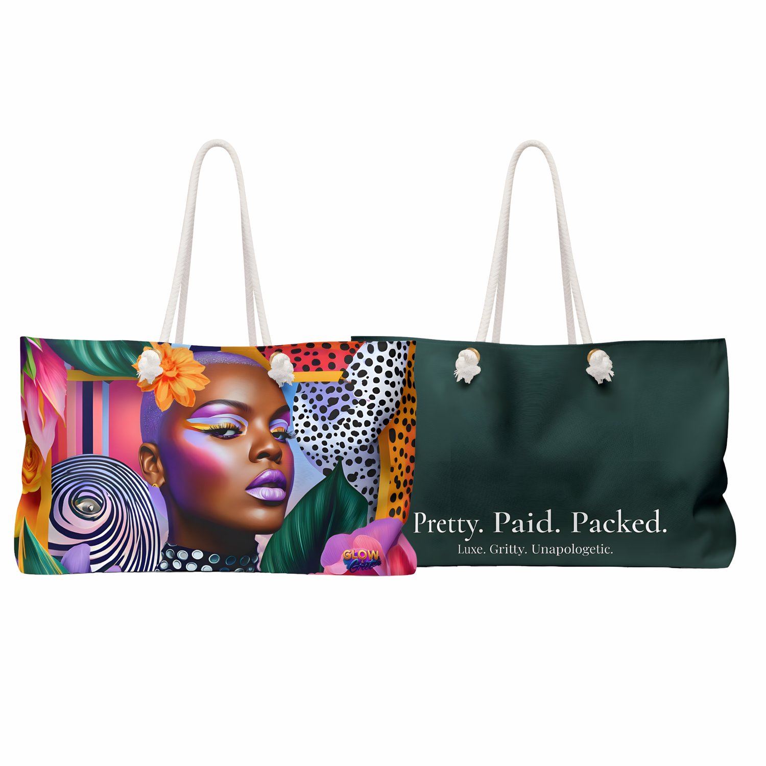 The Grounded & Glowing Weekender is designed for women who move with purpose, clarity, and quiet confidence. Rich color and vibrant editorial artwork bring artful energy to every trip, while the bold “Pretty. Paid. Packed.” statement on the back adds a confident reminder of the lifestyle you’re building.
