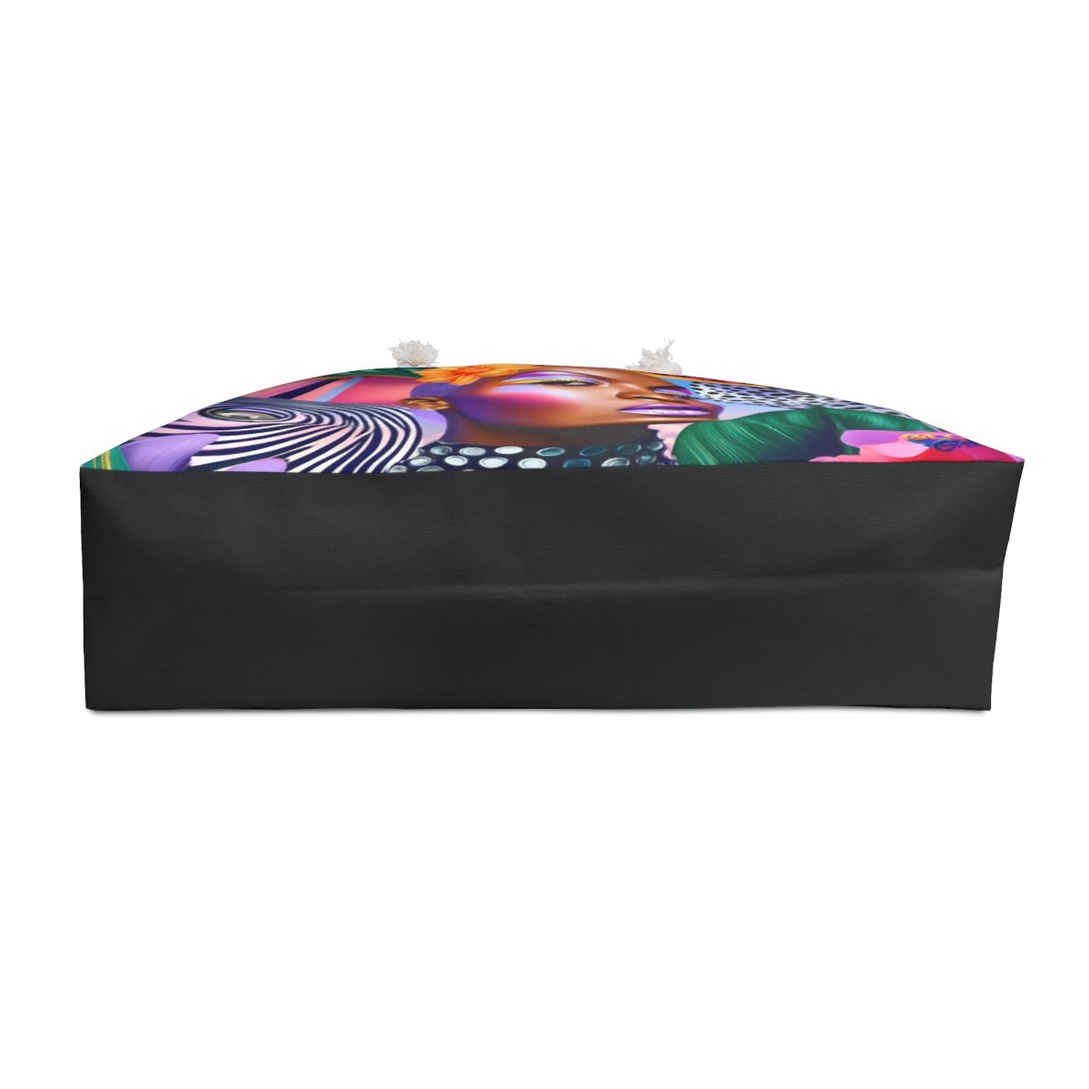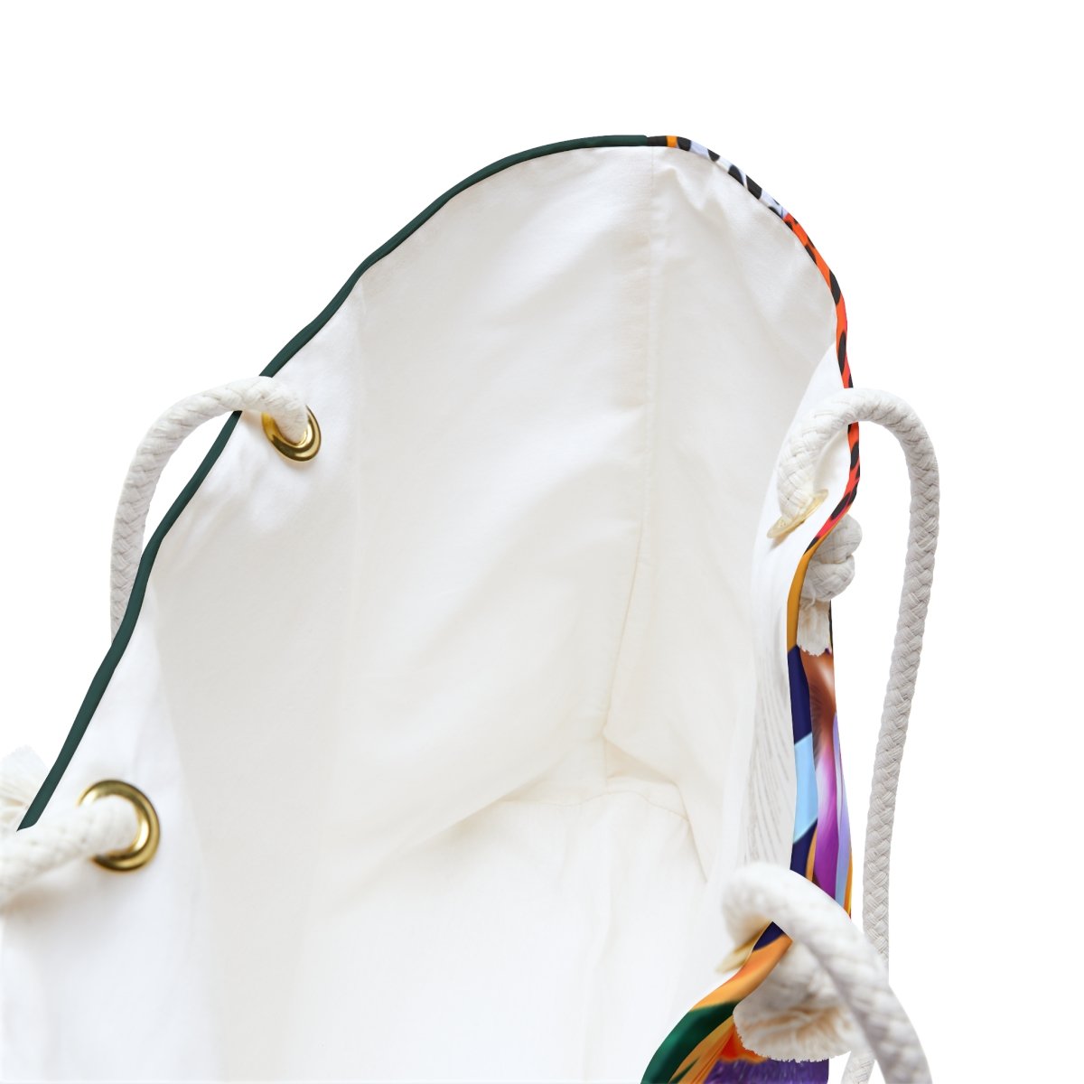 The vivid exterior print wraps around a structured T-bottom silhouette that keeps your essentials organized and ready for wherever the day takes you. Cream rope handles and gold-tone grommets add warmth and durability, while the soft cream interior lining protects everything you pack inside.