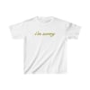 Lyrics "I'm sorry" printed on a lightweight 90s style baby tee.