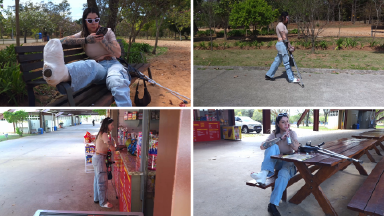 Rebeca sits on a bench, rests her casted leg, wiggles her toes, and enjoys the park breeze.