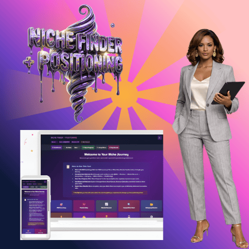 The Niche Finder + Positioning App is an interactive Canva-based business tool that walks creators, coaches, and entrepreneurs step-by-step through discovering where they truly fit in the market — and how to clearly position themselves so people understand exactly what they do and who they help.