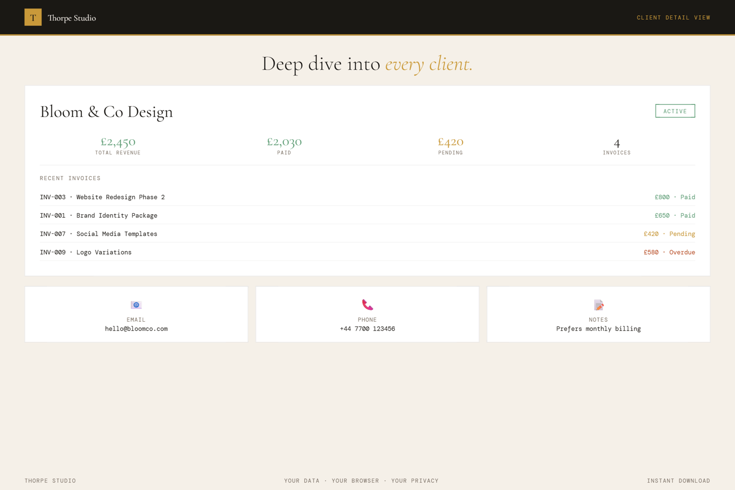 ★ Client Stat Card Dashboard Your entire client base summarised: total clients, active clients, outstanding payment value, total paid to date. Numbers at a glance.