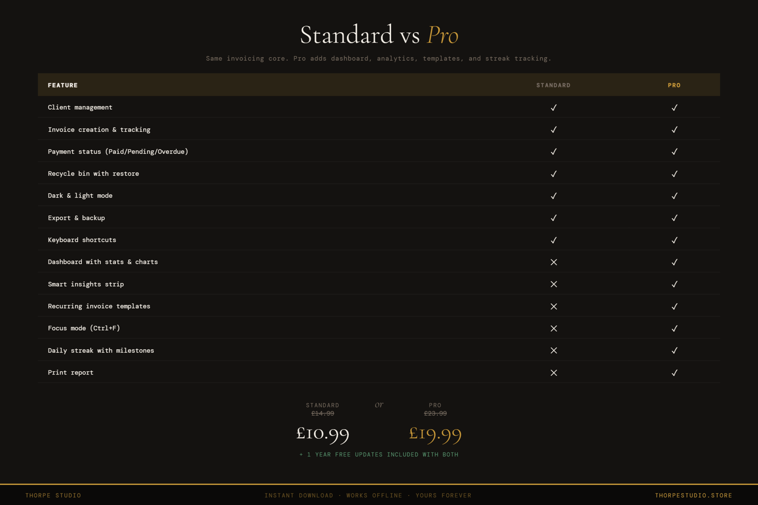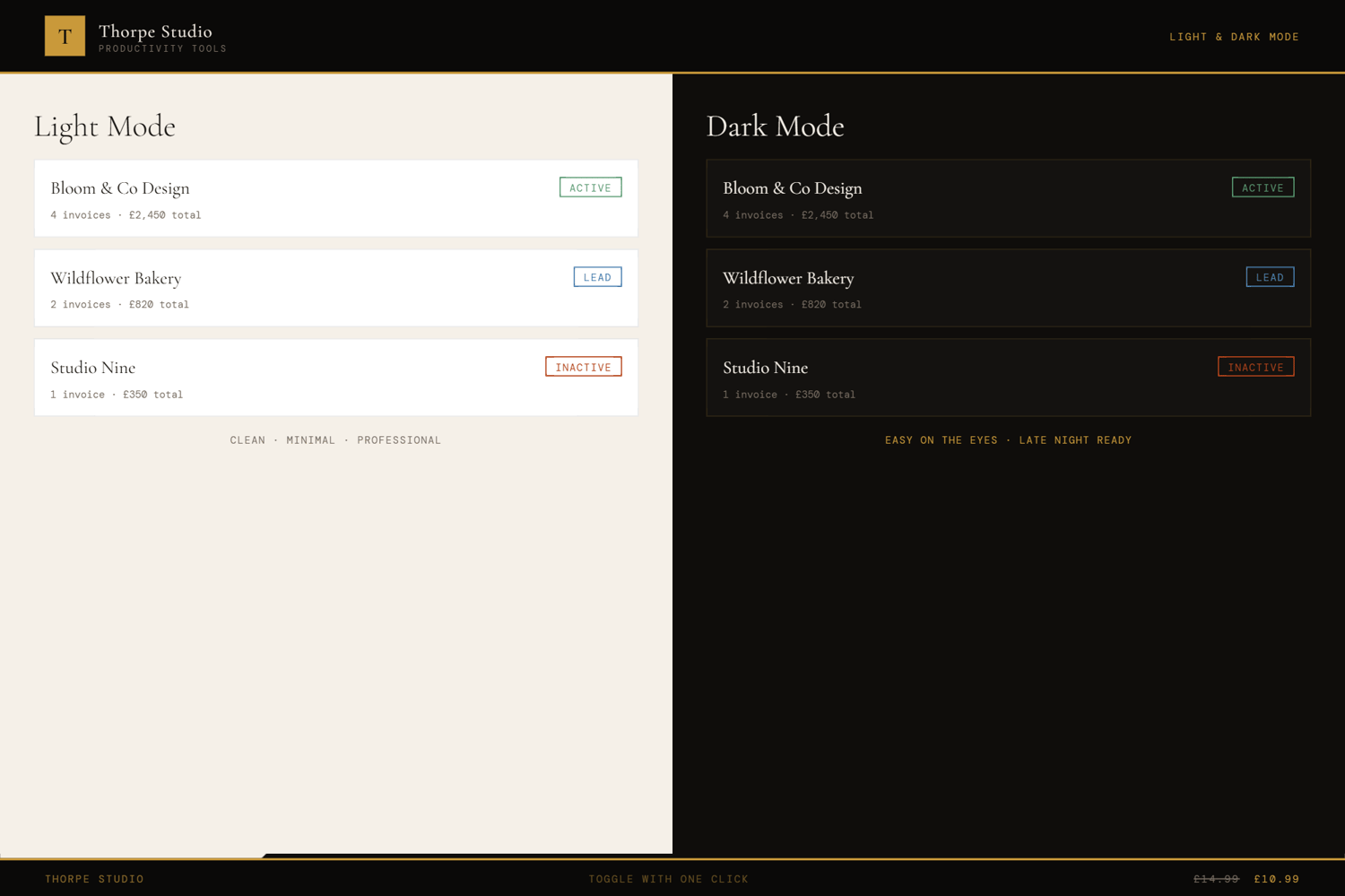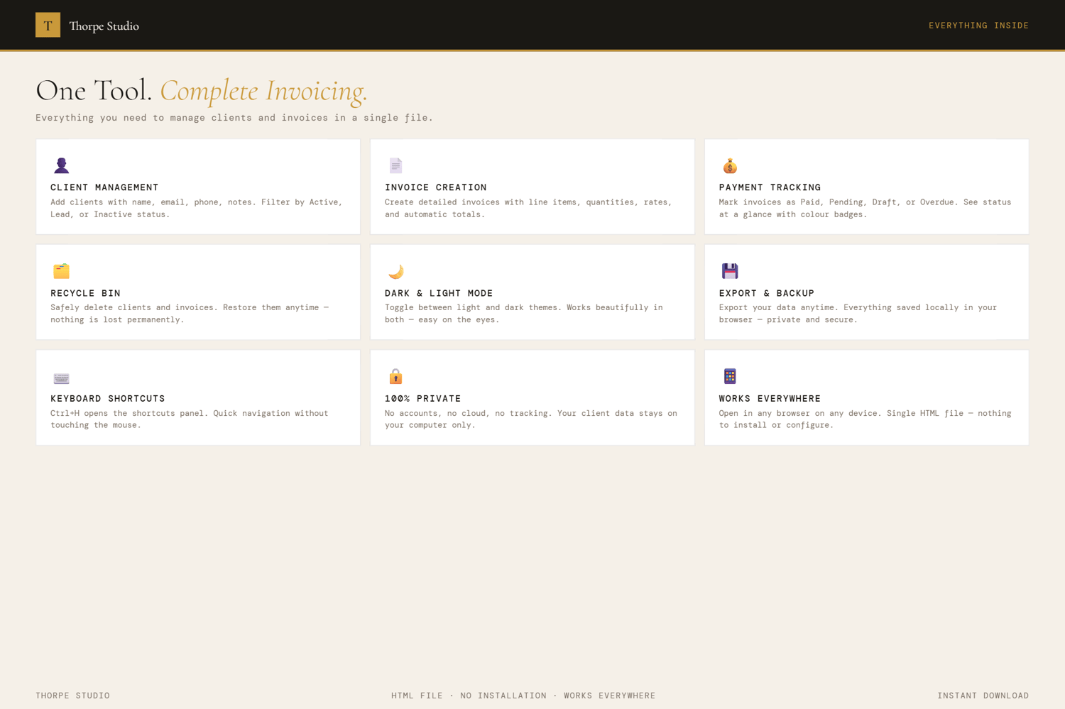 Thorpe Studio builds premium browser-based productivity tools for freelancers and solopreneurs. Every tool opens instantly in your browser, works offline, requires no account, and keeps your data private on your device. No subscriptions. No cloud. No friction. Just you, your ideas, and the tools you need to move forward.