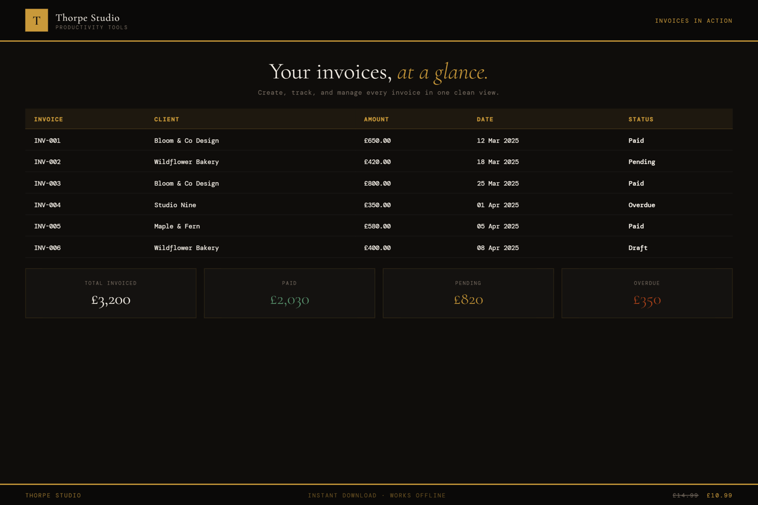 This is a digital HTML file—not accounting software, not an invoicing platform like Stripe Invoices or FreshBooks. You download it once and it lives on your device. Your client and invoice data are stored locally using browser storage (localStorage)—completely private, on your computer only. This tool is for tracking and organisation; it does not automatically send invoices or process payments. Always keep exported backups of your client and invoice data. If you clear your browser storage, data is lost—use the export function to back up regularly. There are no refunds on digital products. For technical help, contact us and we'll assist.