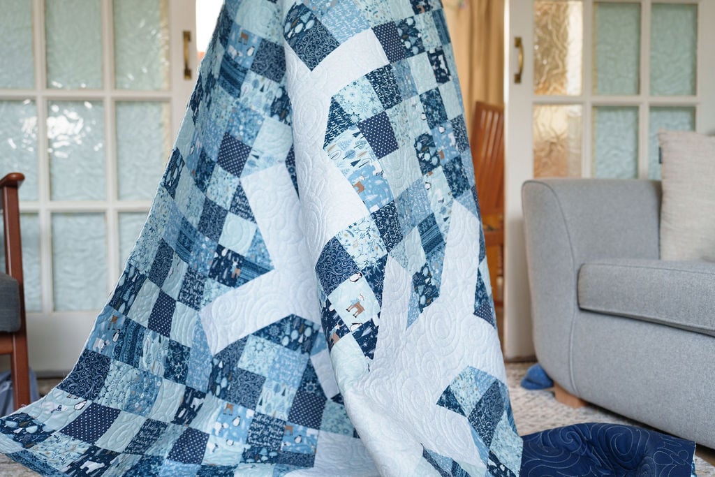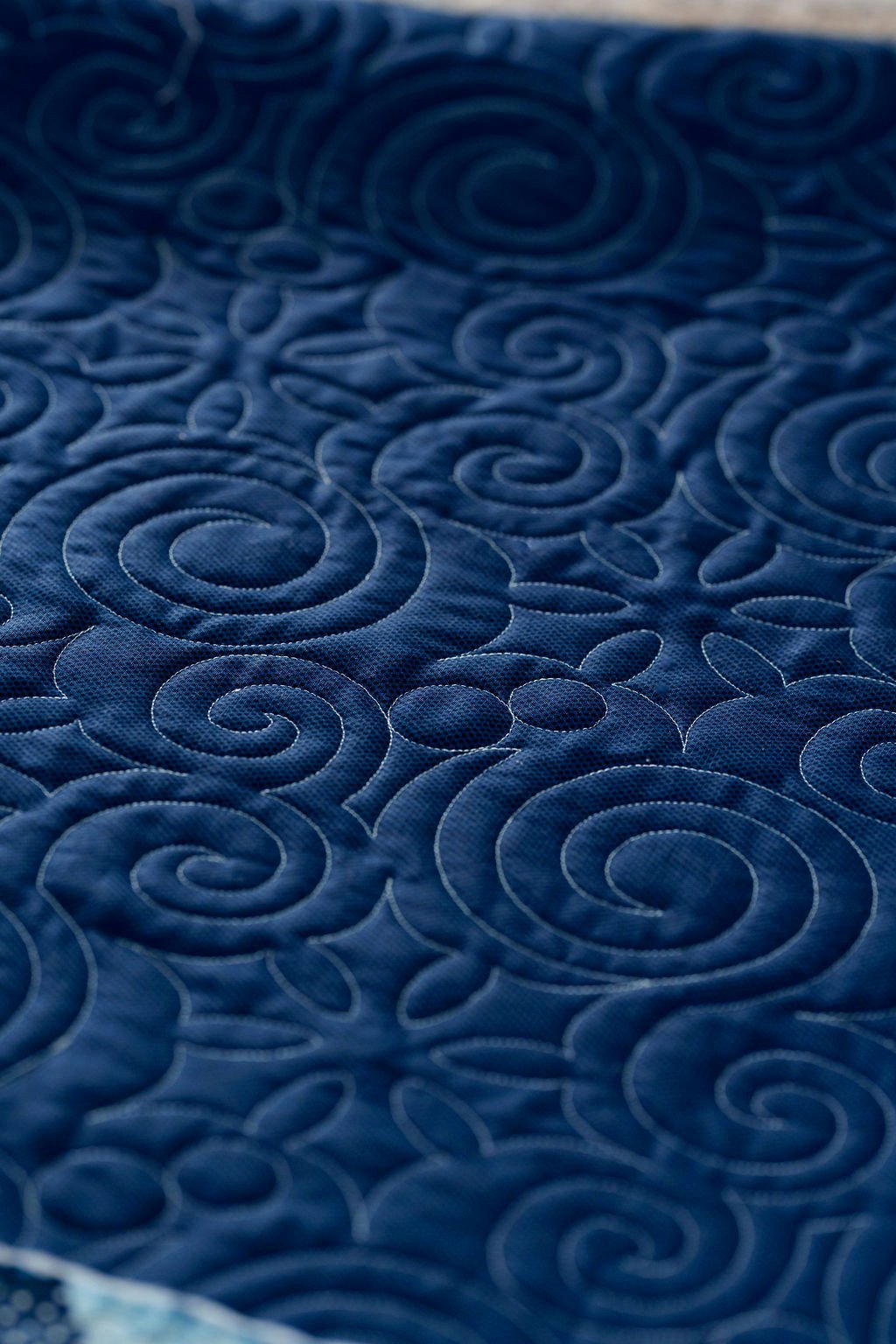 ✔ Handmade Quality - Expertly pieced and longarm quilted with swirling motifs that echo falling snow, adding beautiful texture and drape. The contrast stitching shines on the navy blue quilt back.