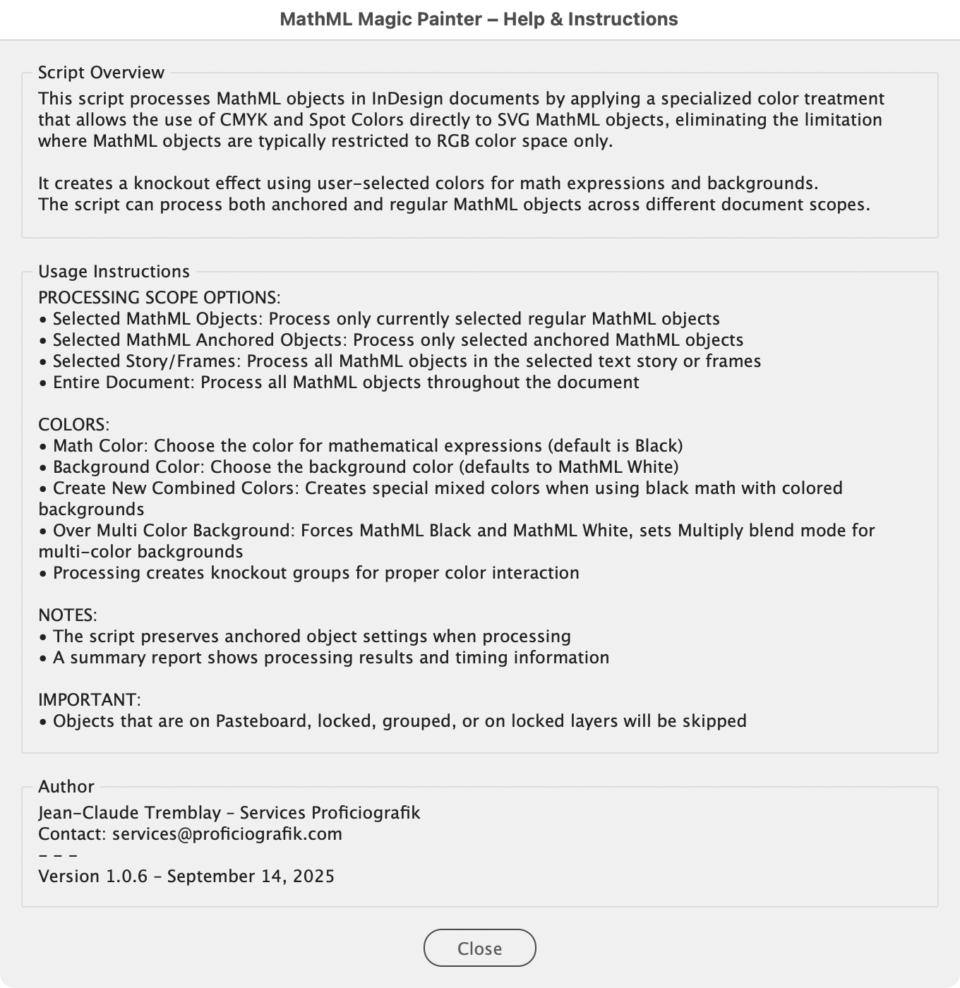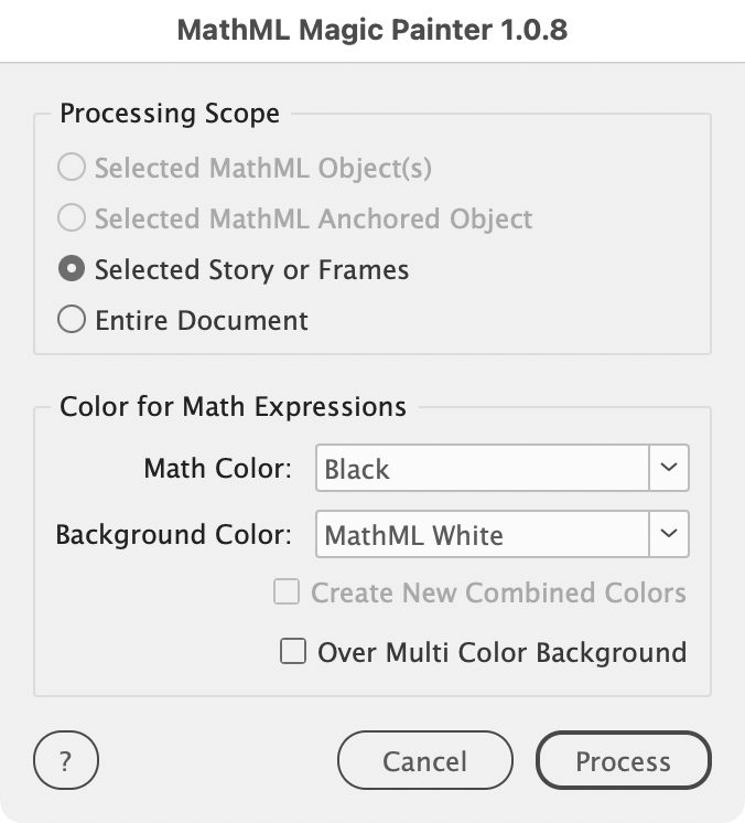 MathML Magic Painter addresses a critical limitation in Adobe InDesign where MathML objects are restricted to RGB color space, preventing the use of CMYK and Spot colors essential for professional printing workflows. This script processes MathML mathematical expressions by applying a specialized knockout technique that enables full CMYK and Spot color support while maintaining the integrity of complex mathematical formulas.