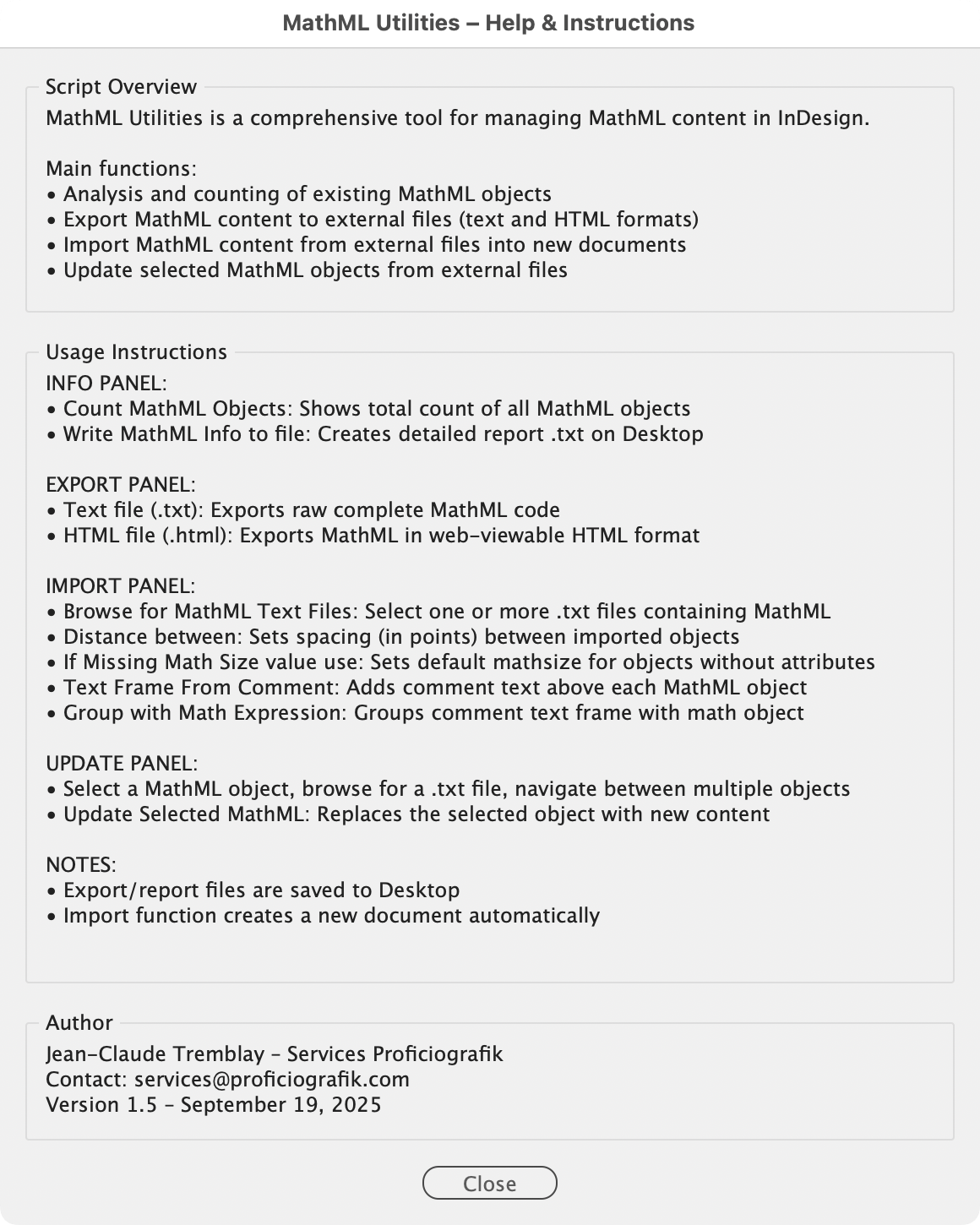 MathML Utilities streamlines the management of mathematical expressions (Math ML) in Adobe InDesign documents. This tool allows users to efficiently count, analyze, and export existing MathML objects while providing detailed reports on their distribution and formatting across document pages. The script also enables import of MathML content from external files, automatically creating properly formatted Math expressions in a new document.