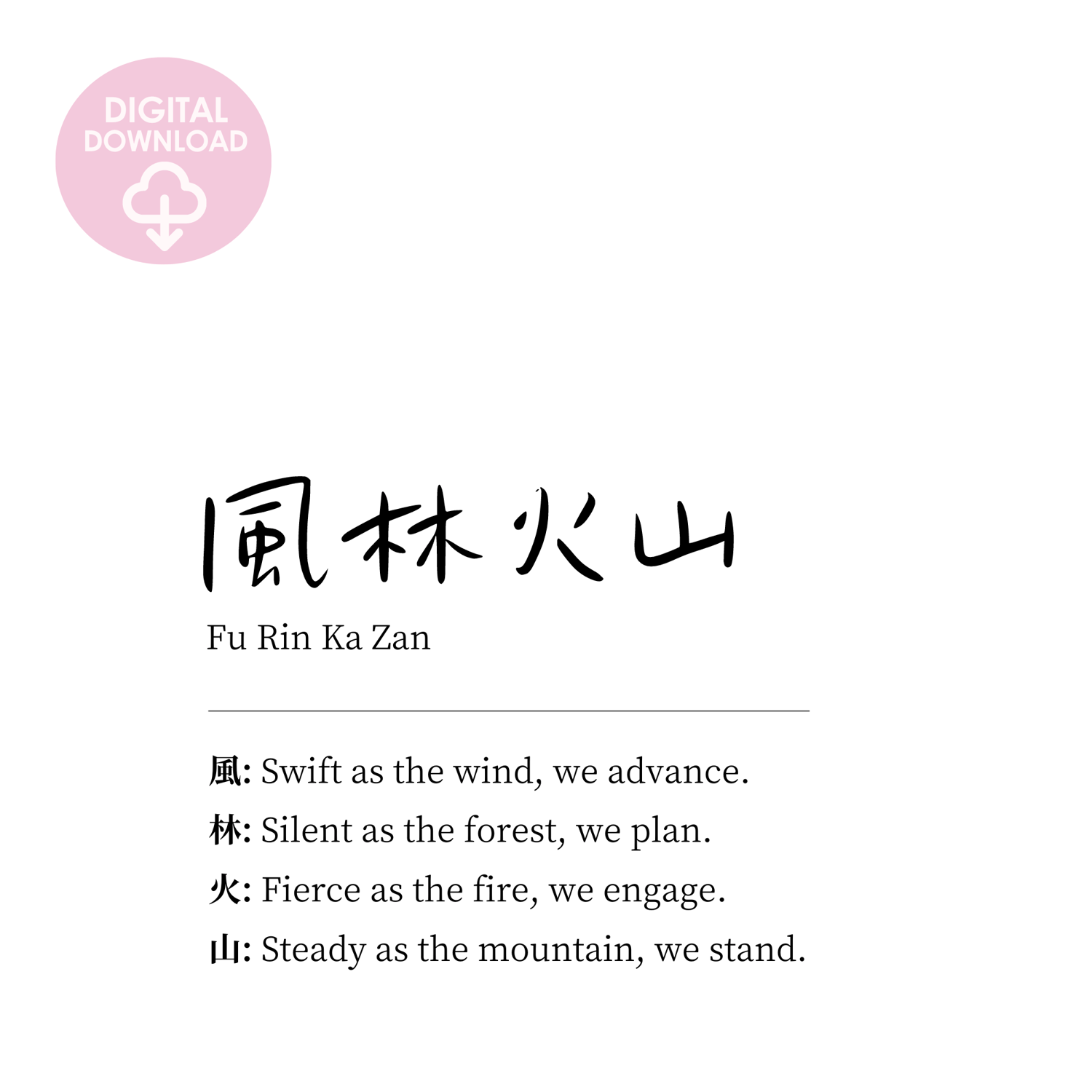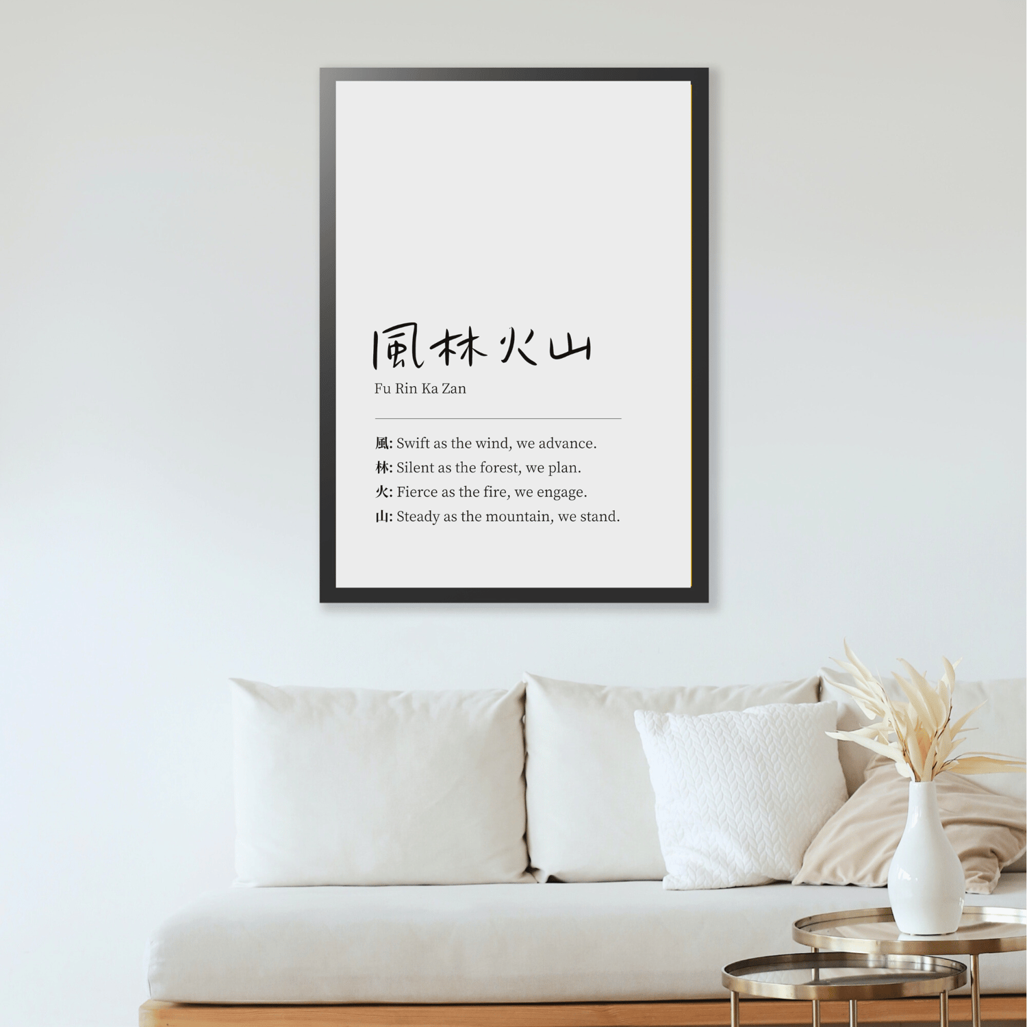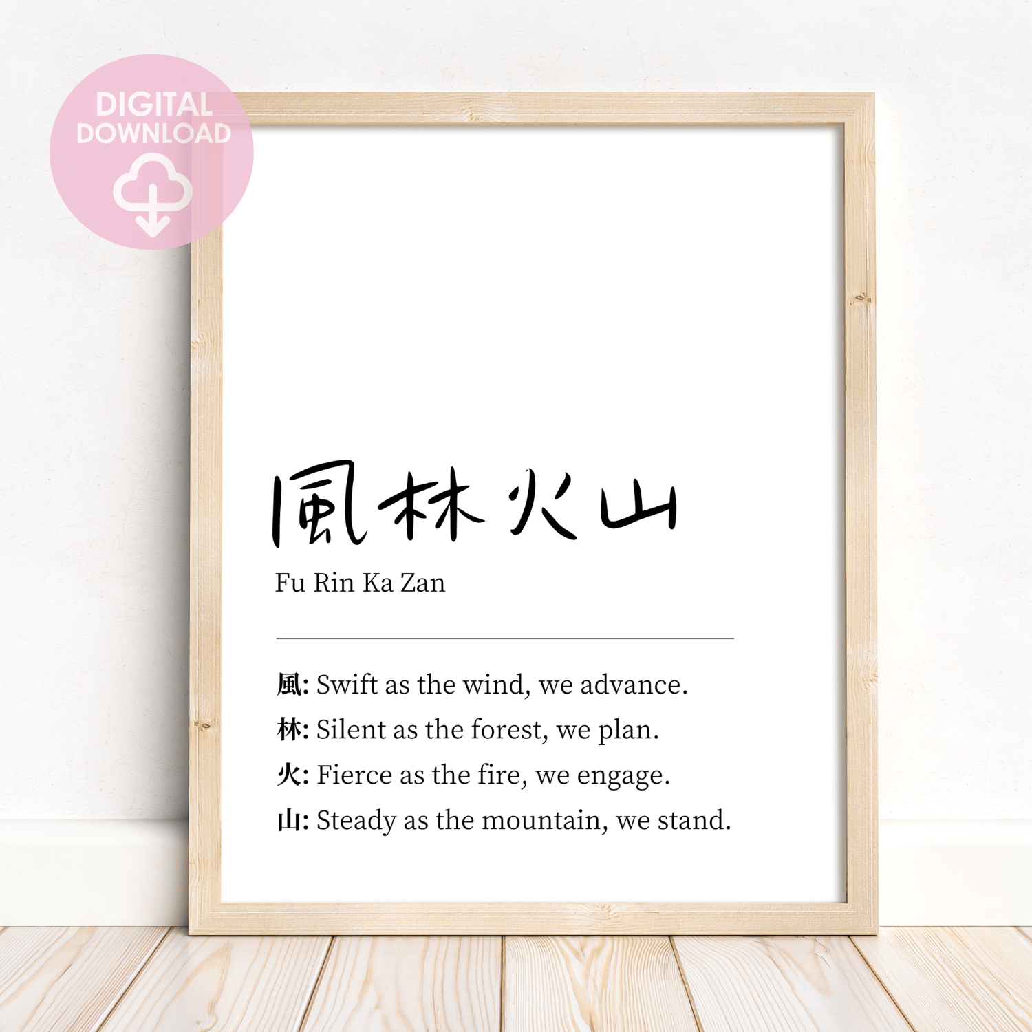 Dive into the legendary world of Samurai spirit, where the profound leadership quote of Takeda Shingen comes to life. Printed on high-quality material, this wall art embodies the essence of FU RIN KA ZAN—Wind, Forest, Fire, Mountain—metaphors for the qualities a great leader must possess.