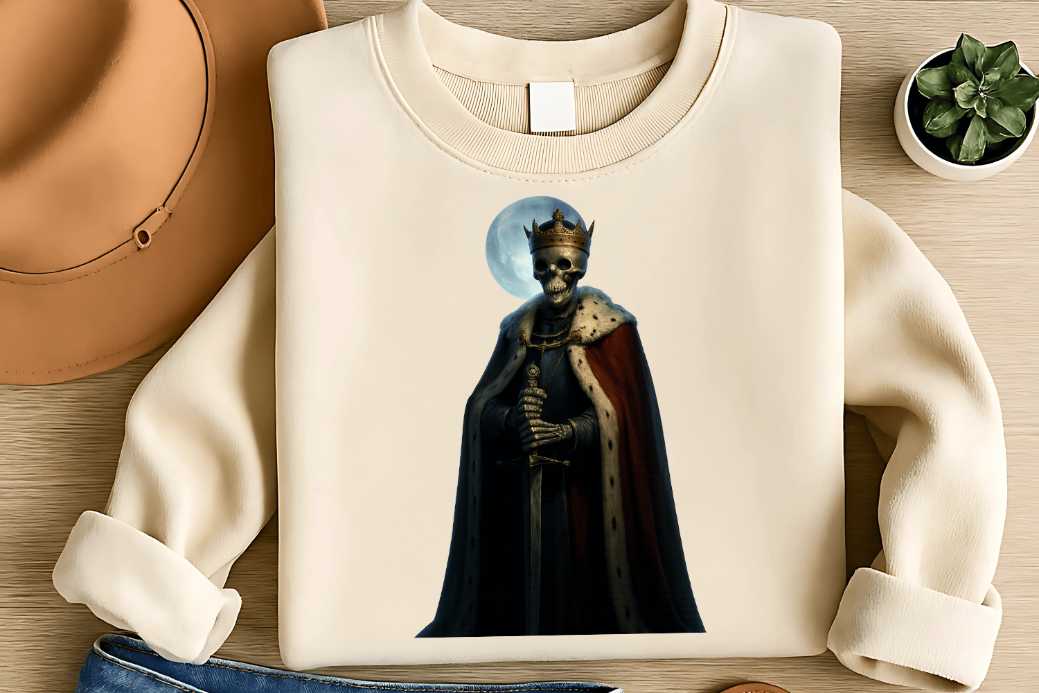Majestic Bone King Sublimation PNG – Regal Skeleton for Halloween T-Shirts – Dark Fantasy Theme – 300 DPI Instant Digital Download