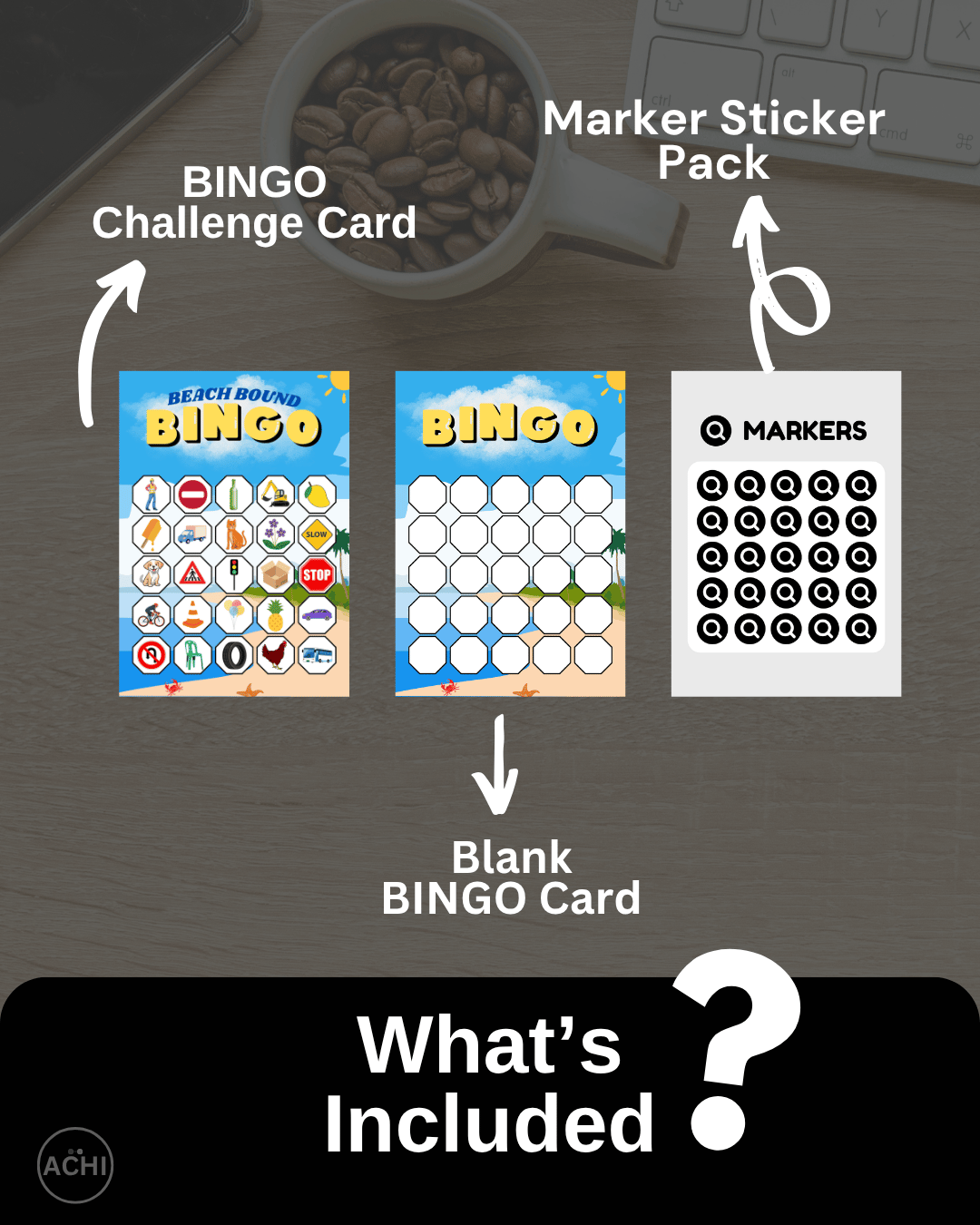 This pre-designed bingo card, customizable blank card, and marker sticker pack are designed to elevate your game experience. Perfect during travel to the beach—Just download, print (or use digitally), and let the fun begin!